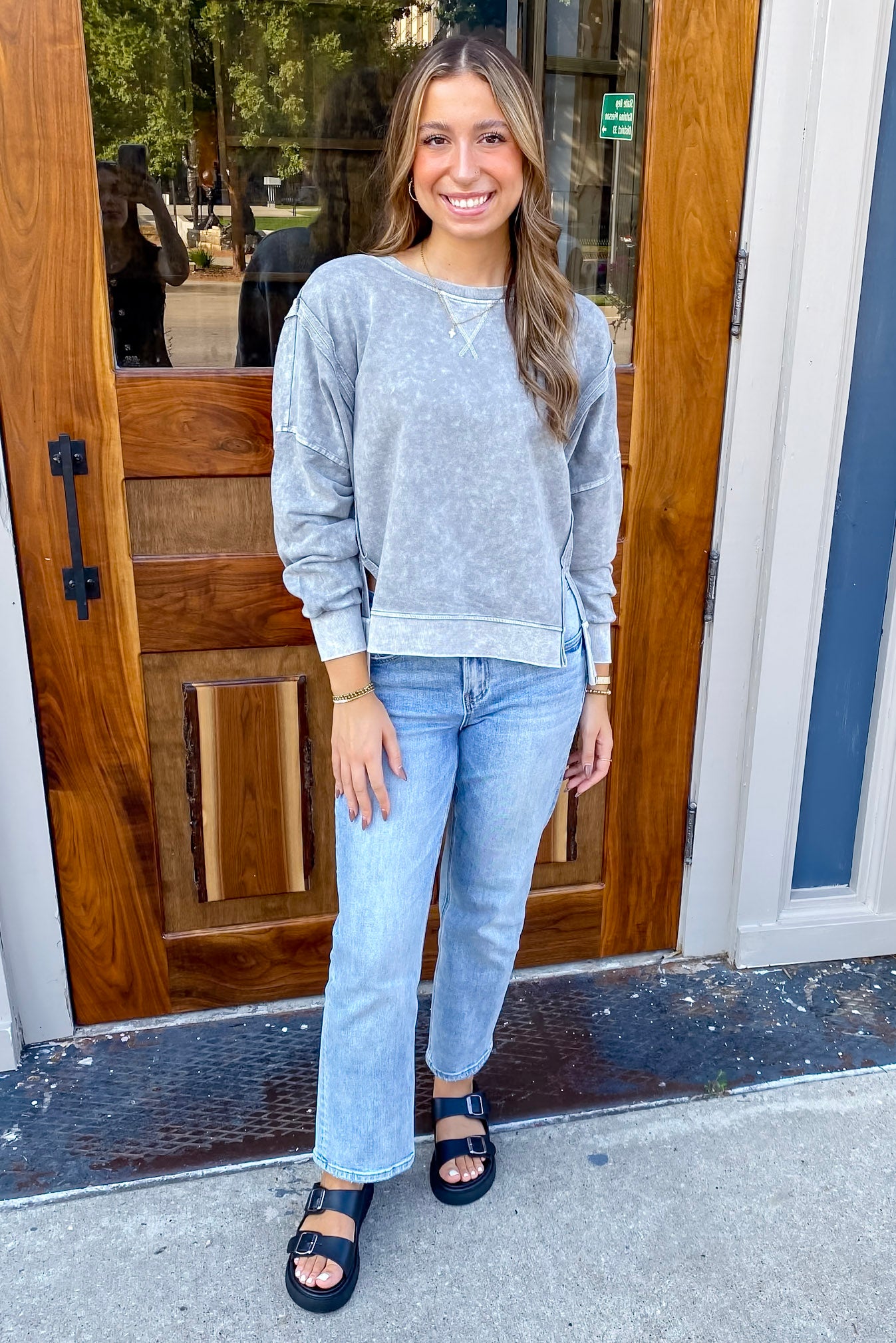 Meet your new favorite throw-on-and-go layer. The Sunday Stroll Sweatshirt is an effortlessly cool mineral-washed pullover in a muted sage gray. It features a relaxed fit, raw hemline, and side slits for that perfectly laid-back drape. Layer it over a plaid shirt like shown, or keep it simple with denim—either way, this top brings chill-weather vibes in the cutest way possible.