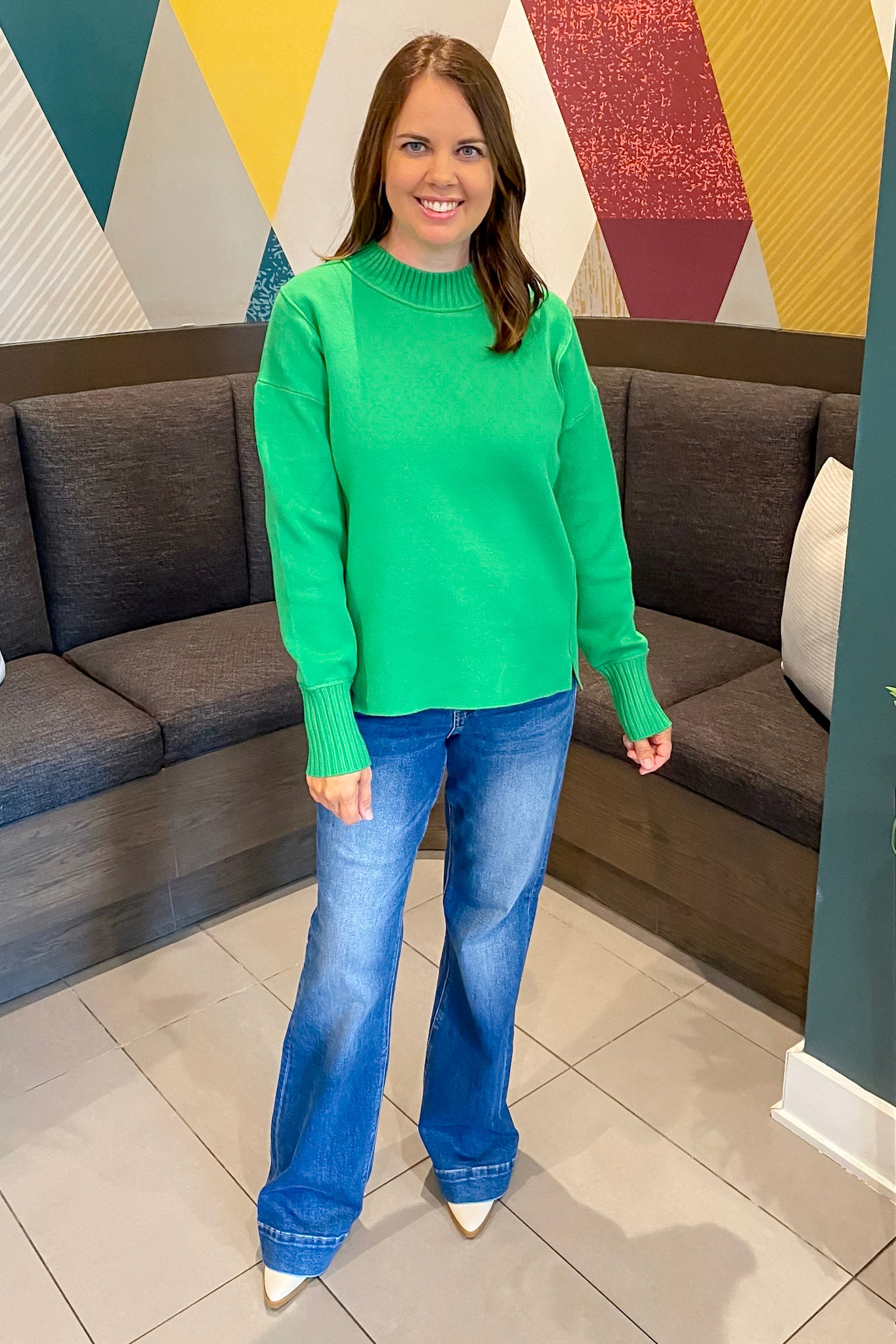 The Winter Essential Cozy Green Sweater is your winter must have in the most beautiful green! With its relaxed fit, cozy ribbed cuffs, and wide crew neckline, this pullover brings warmth without sacrificing style. Minimalist but elevated, it’s easy to dress up or down—basically, it’s the sweater that does it all. Whether you're layering it under a coat or wearing it solo with statement earrings, it’s a cold-weather classic you’ll love on repeat.