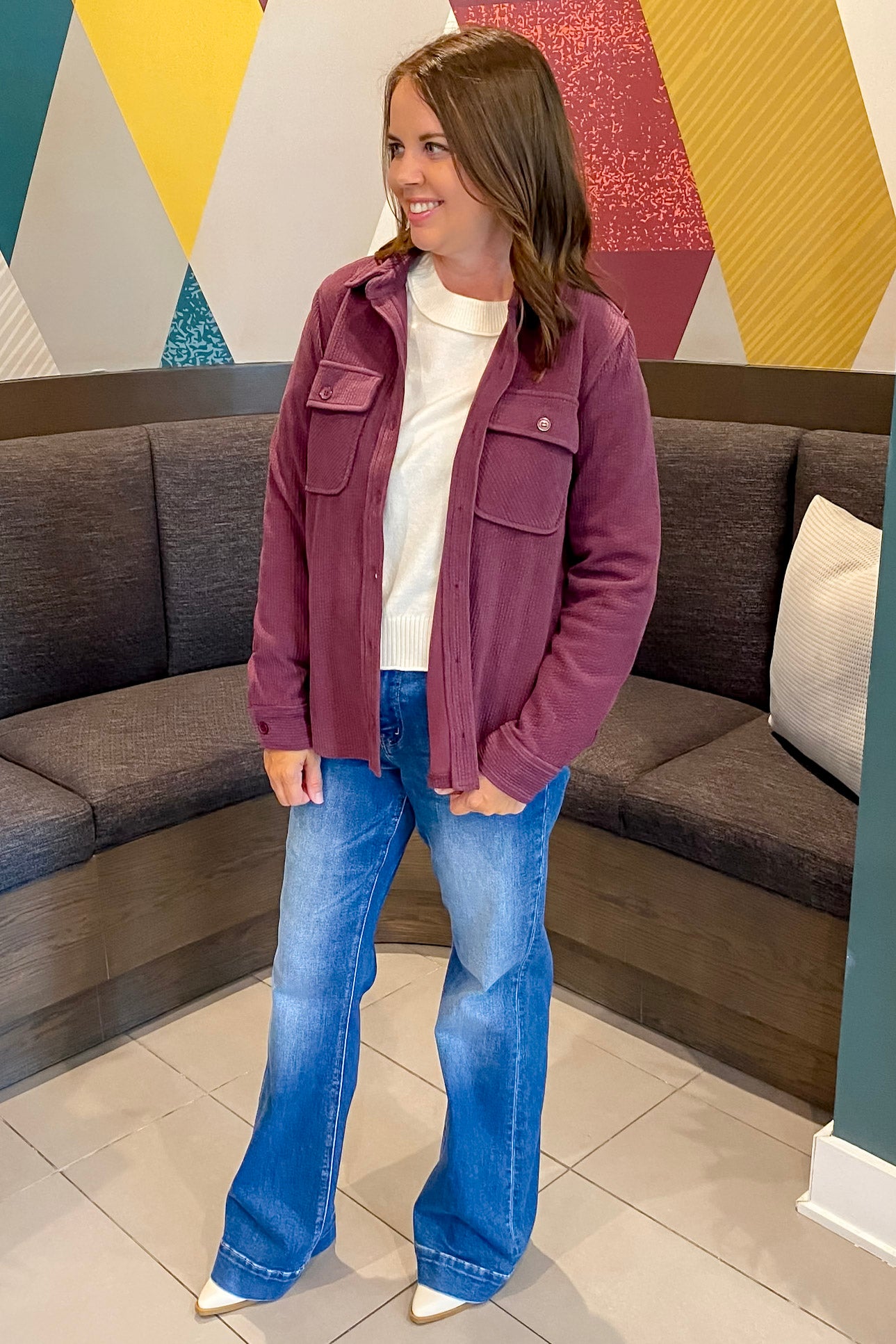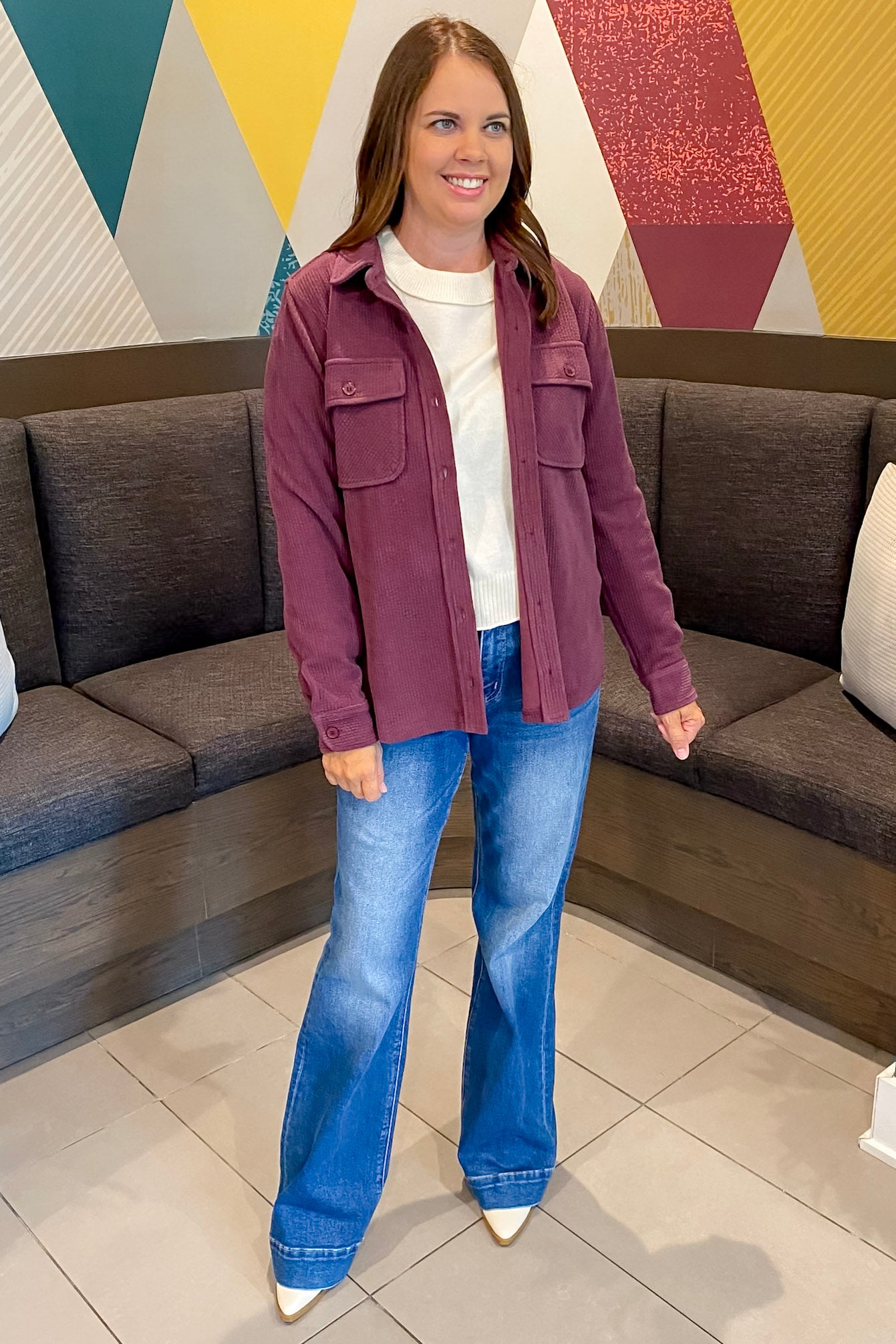 Say hello to the All My Life Plum Shacket—your new winter go-to for effortless layering. This soft ribbed button-up in a dreamy mulberry plum hue blends the cozy comfort of a sweater with the versatility of a jacket. Featuring front patch pockets and a relaxed fit, it’s cute worn open over a tee or buttoned up as a top layer. It's thick enough to keep you warm, but still light enough for everyday layering. Basically? A total outfit maker.