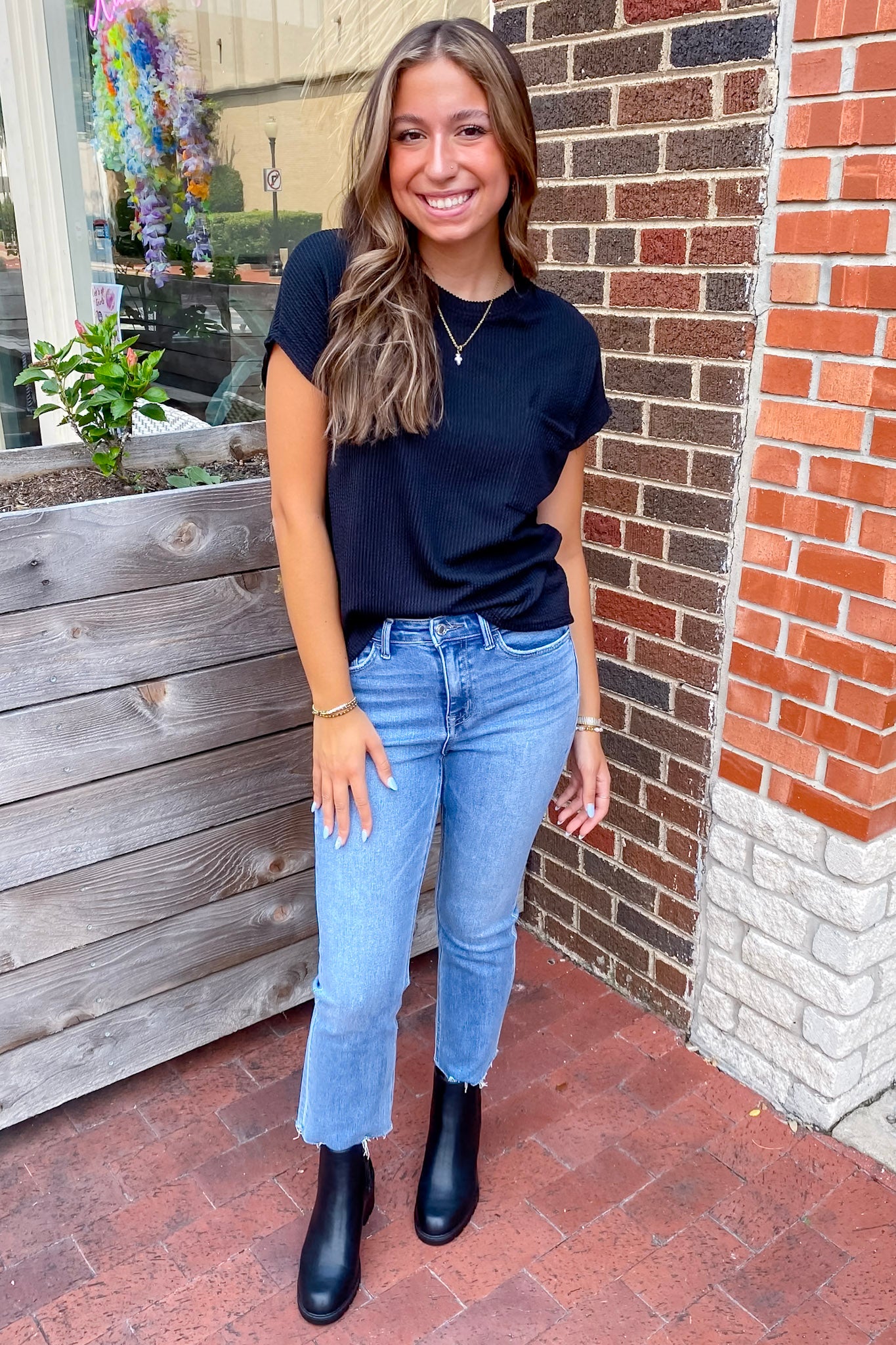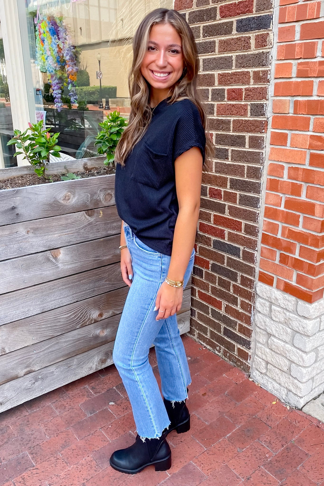 Comfy tops for casual days! This top features ribbed feel, round neckline, short sleeve and front pocket! So soft and casual to wear! Make this your #OOTD