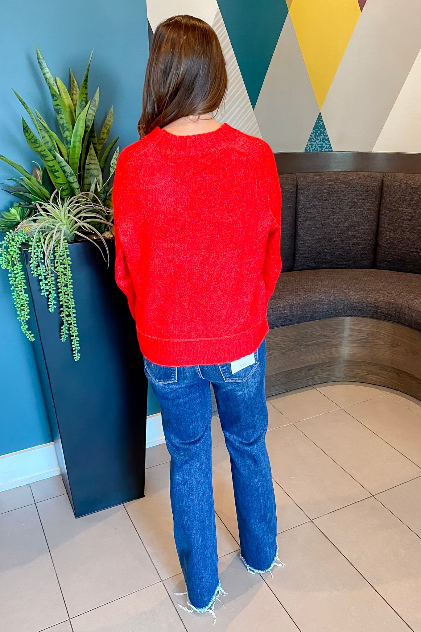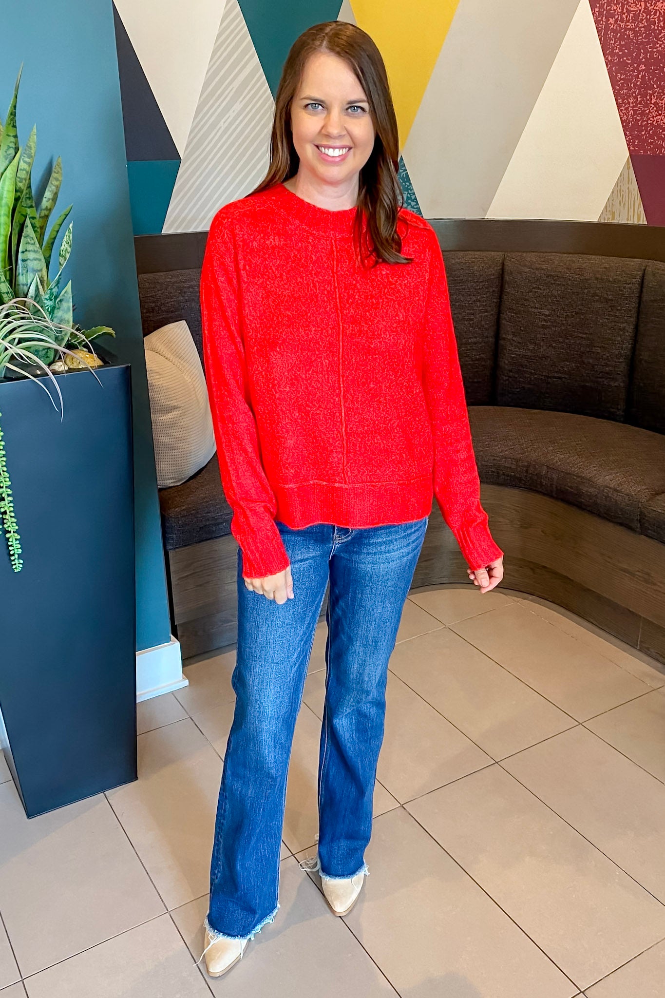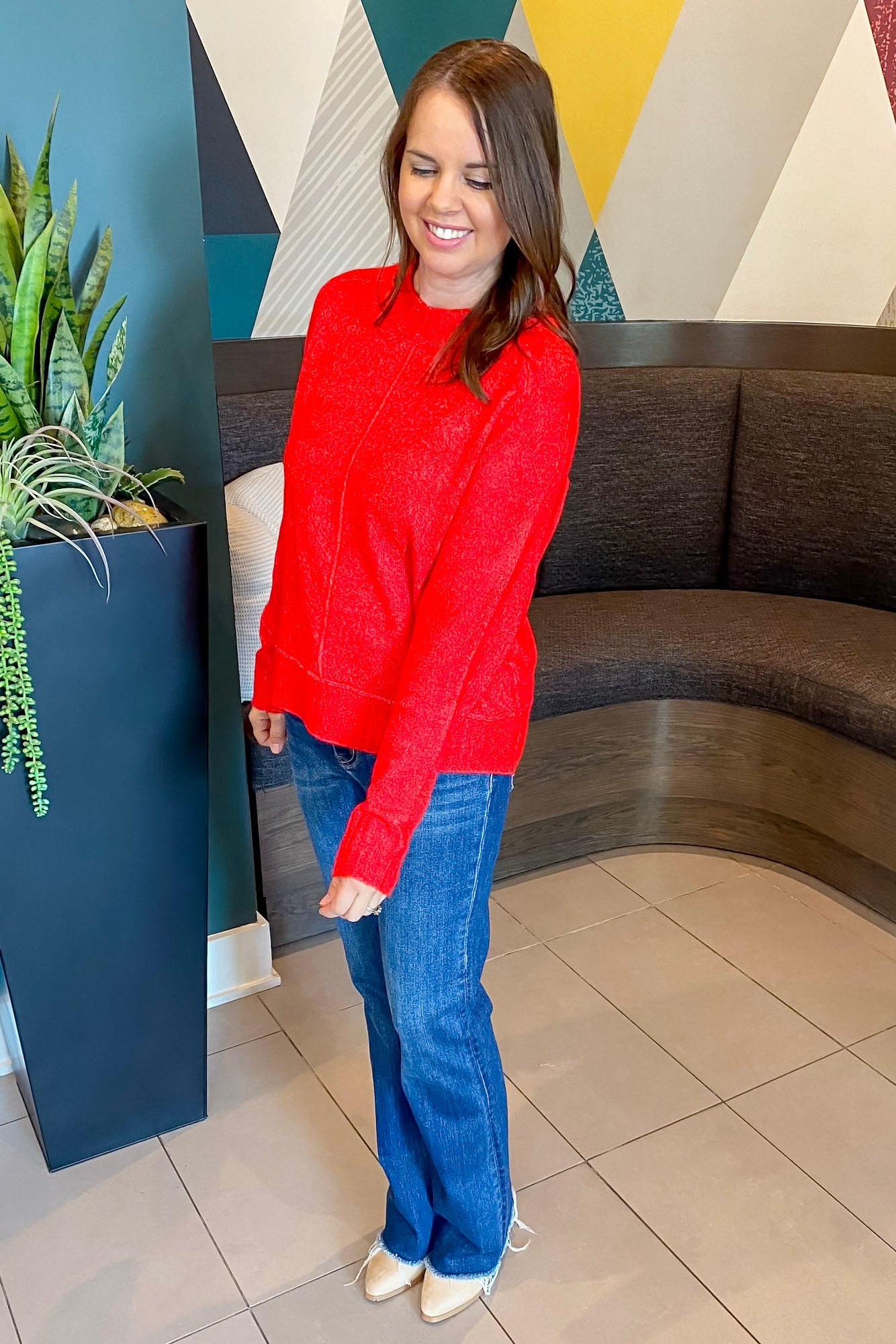Say hello to your new favorite fall layer! This red sweater is spun with flecks of warmth and sweetness, making it as cute as it is cozy. Designed with an easy, relaxed fit and ribbed trim, it’s perfect for chillier days when you still want to look polished. The subtle center seam adds a flattering detail that gives this pullover a little extra structure without losing its slouchy charm. Just add denim and boots and you’re all set!