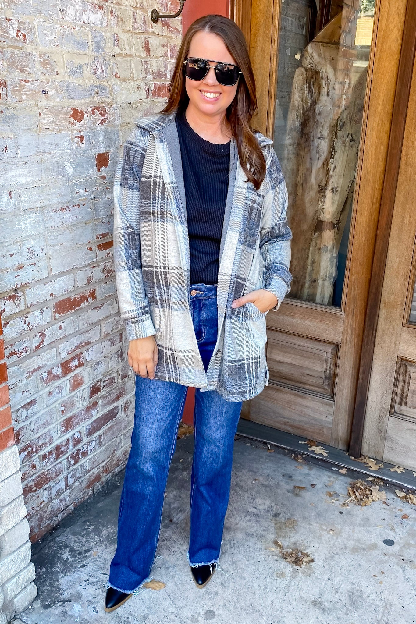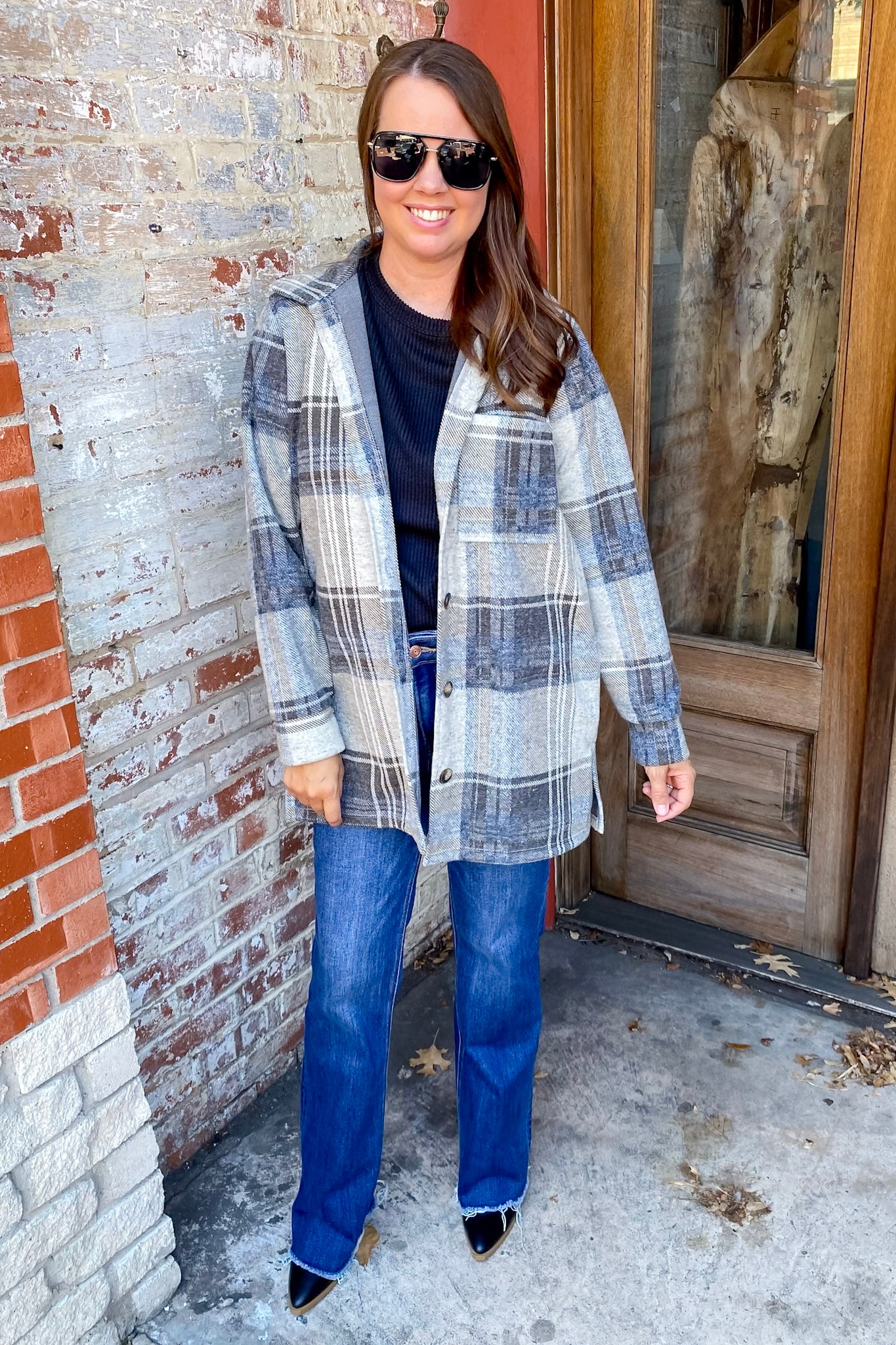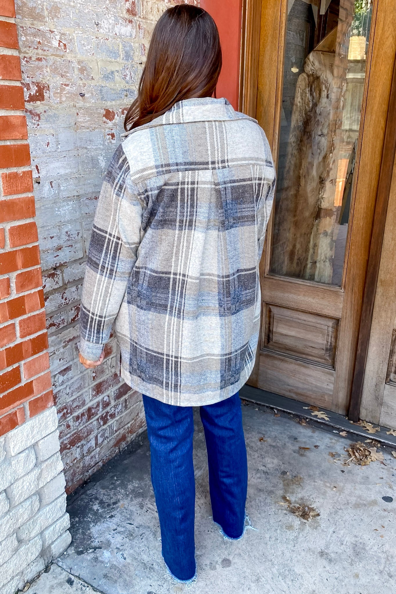 Meet your new fall layering fave. This blue plaid shacket combines the cozy feel of a flannel with the structure of a jacket, making it the perfect throw-on-and-go piece. The soft blue and neutral tones add just the right amount of color while keeping your outfit easy to mix and match. Finished with functional front pockets and a relaxed fit, this one’s all about effortless comfort.
