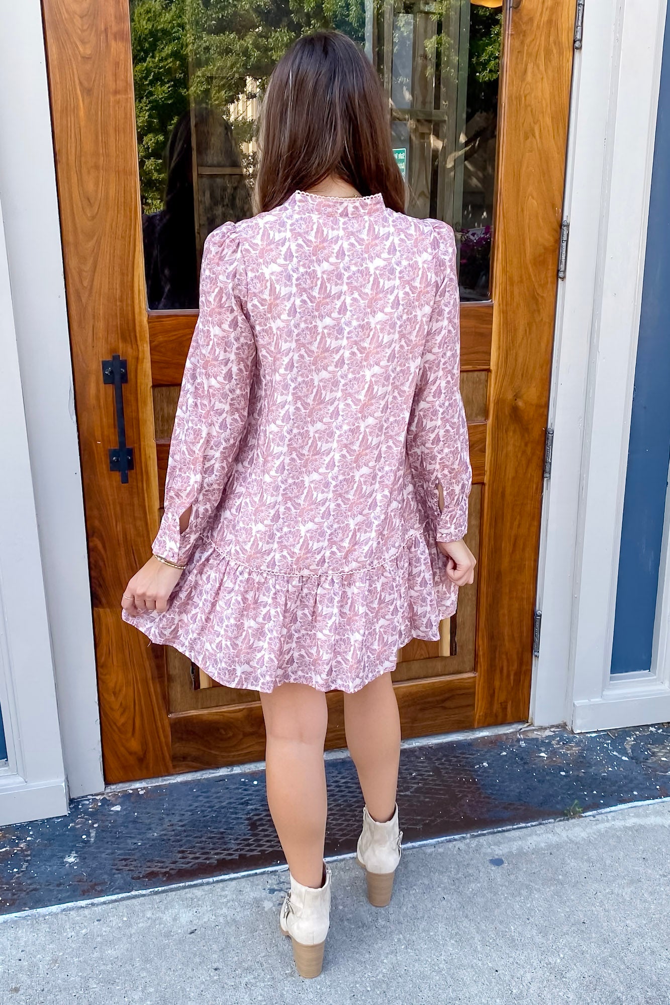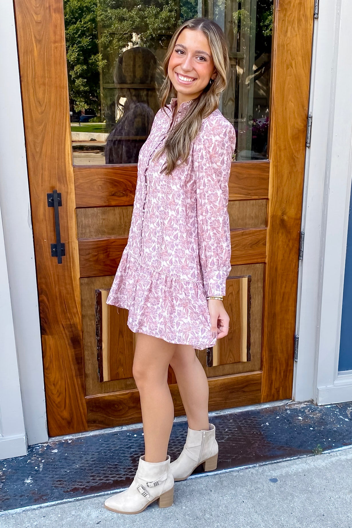 Say hello to your next fall favorite—the Rosy Reverie Ruffle Dress! With a vintage-inspired floral print in dusty mauve and muted plum tones, this dress brings a soft romantic energy perfect for crisp, cool days. The delicate pintuck details and dainty covered buttons down the front add a timeless touch, while the ruffled hem and subtle lace trim give it just the right amount of feminine flair.