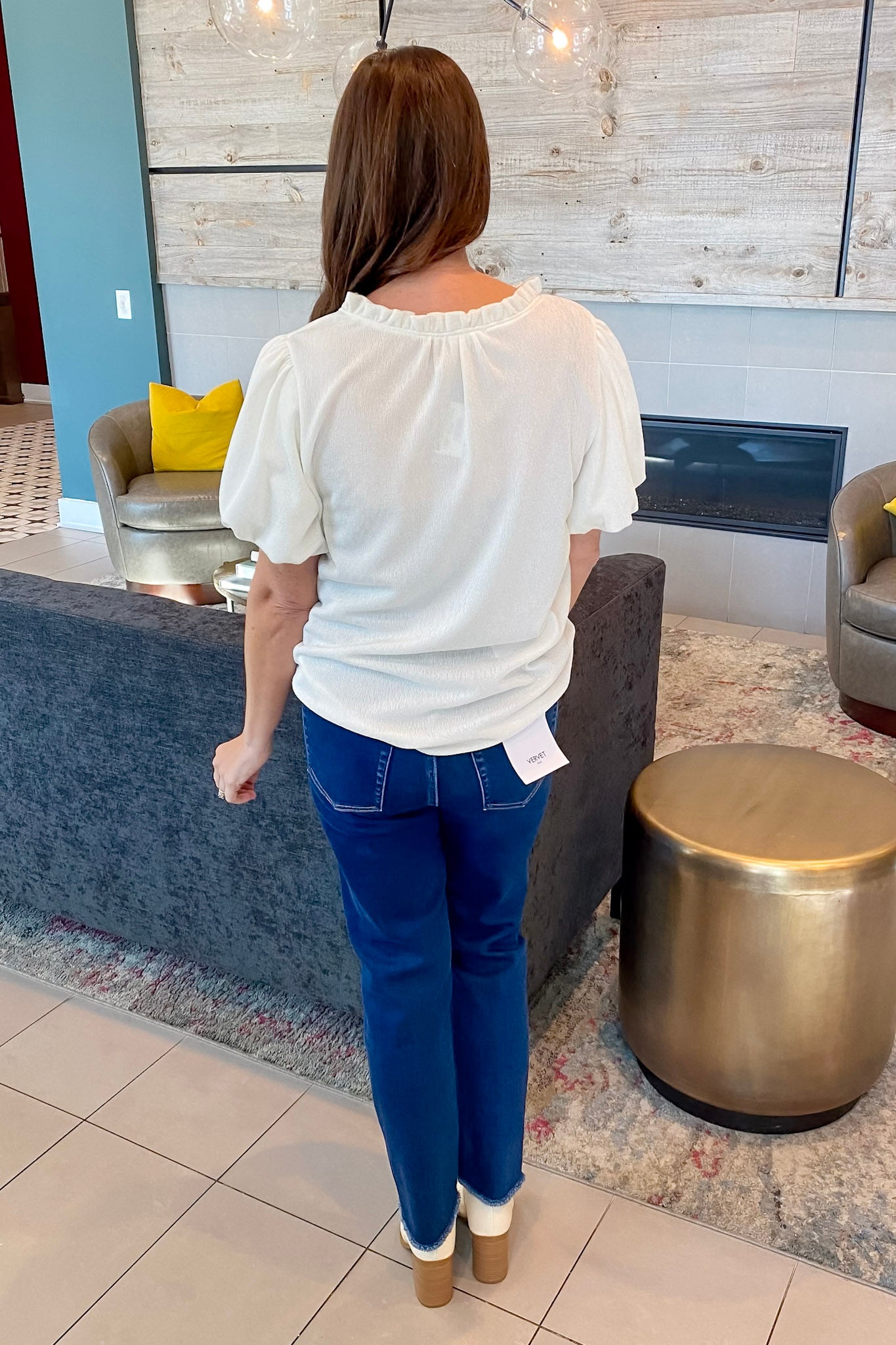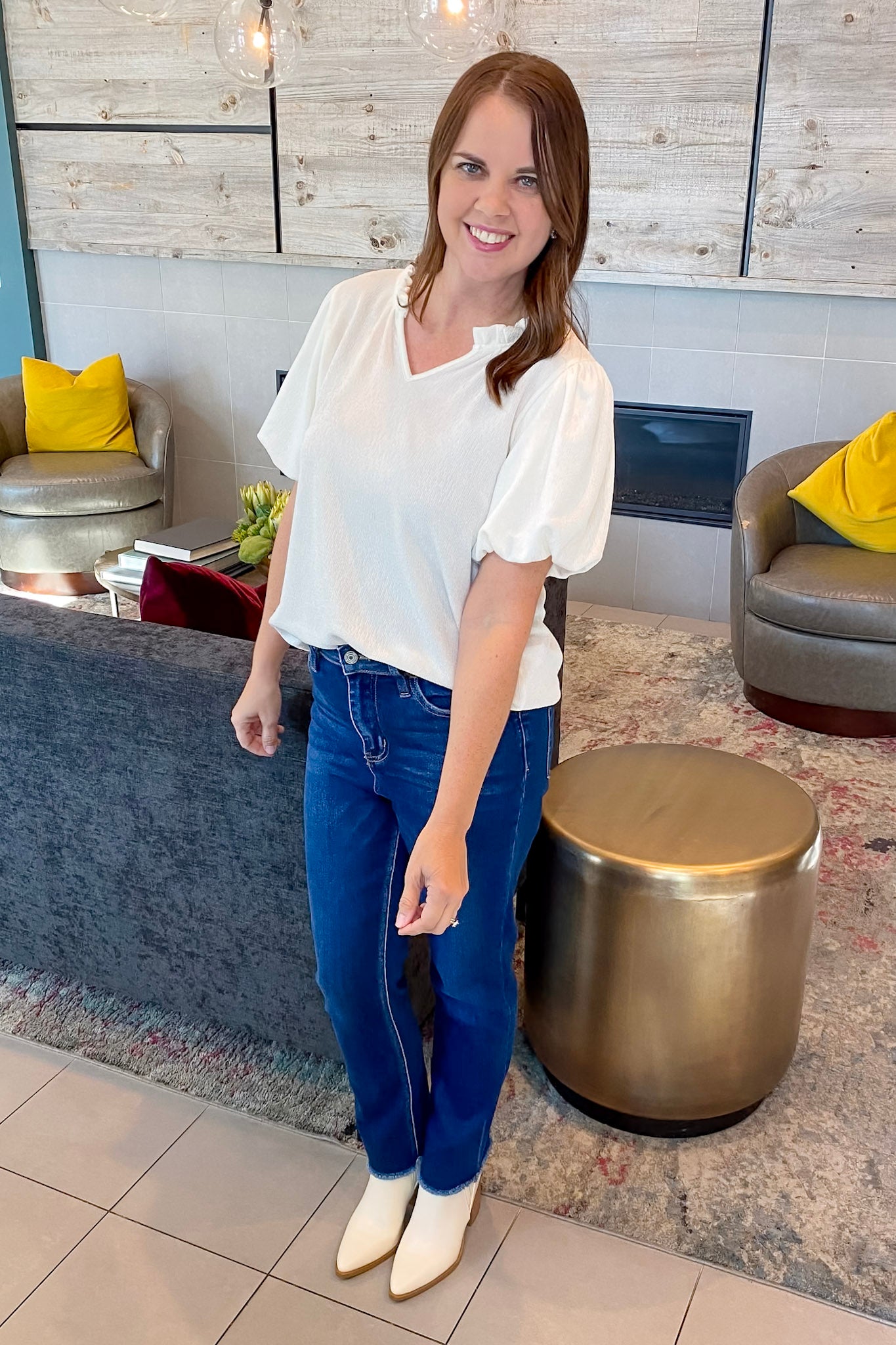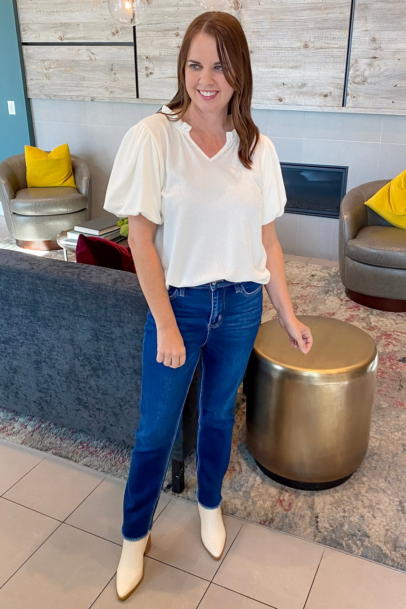 Turn up the volume in this bold and beautiful shimmer ruffle-trim top. Designed in a rich white gold, this blouse features puff sleeves, a flirty split neckline with delicate ruffle detail, and a relaxed silhouette that flatters with zero fuss. It’s lightweight with just enough texture to give your outfit that extra pop—perfect for when you want to feel girly but put-together.