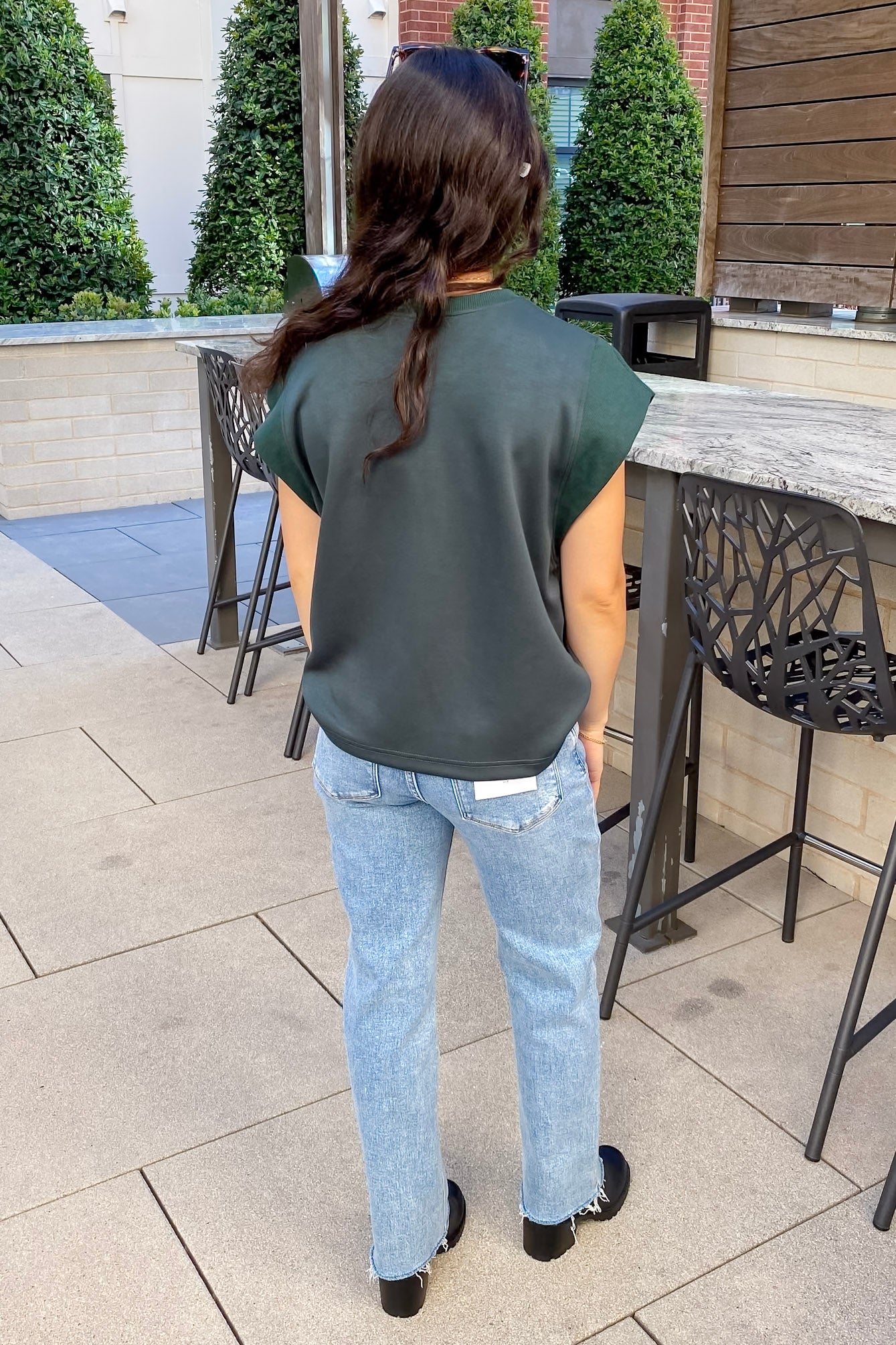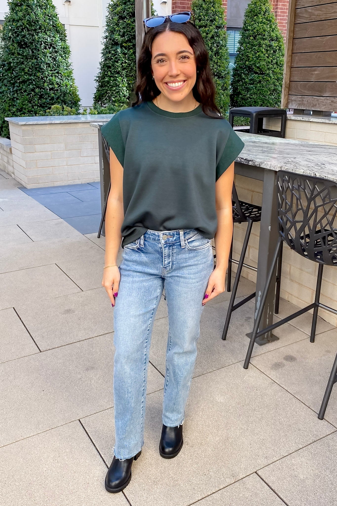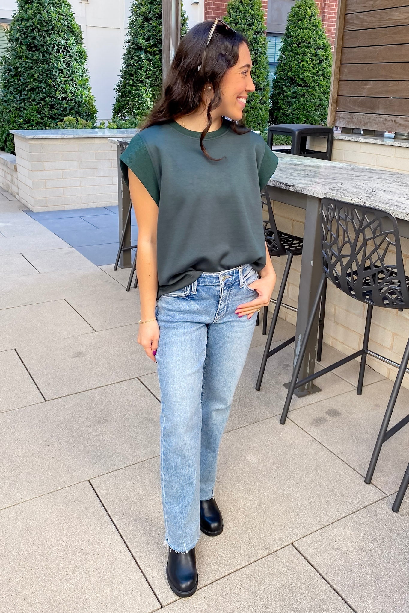 Elevate your basics with this dreamy forest green cap sleeve top—sleek, structured, and effortlessly chic. The cozy knit texture, slightly boxy fit, and high crew neckline give it a clean, put-together feel without trying too hard. The rolled-edge sleeve detail adds just enough personality while keeping it totally wearable. It's that “throw on and go but still look cute” kind of top that will be on repeat all season long.