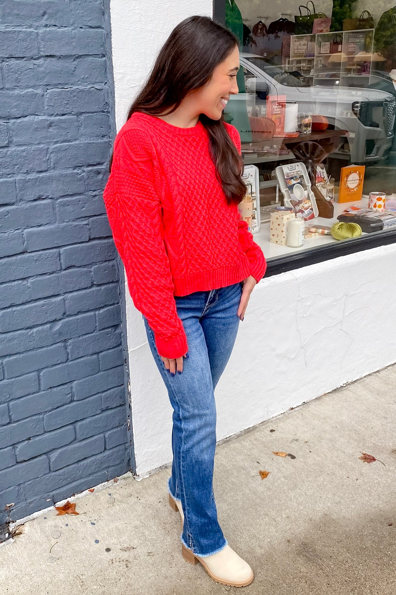 Cozy up in color with the Winter Dreams Braided Red Sweater! This vibrant red beauty brings the warmth and texture you want all winter long. Featuring chunky cable detailing and a relaxed, slightly oversized fit, it’s the perfect piece for layering or making a bold solo statement. The ribbed hem and cuffs keep it snug, while the cheerful hue brightens even the chilliest days.