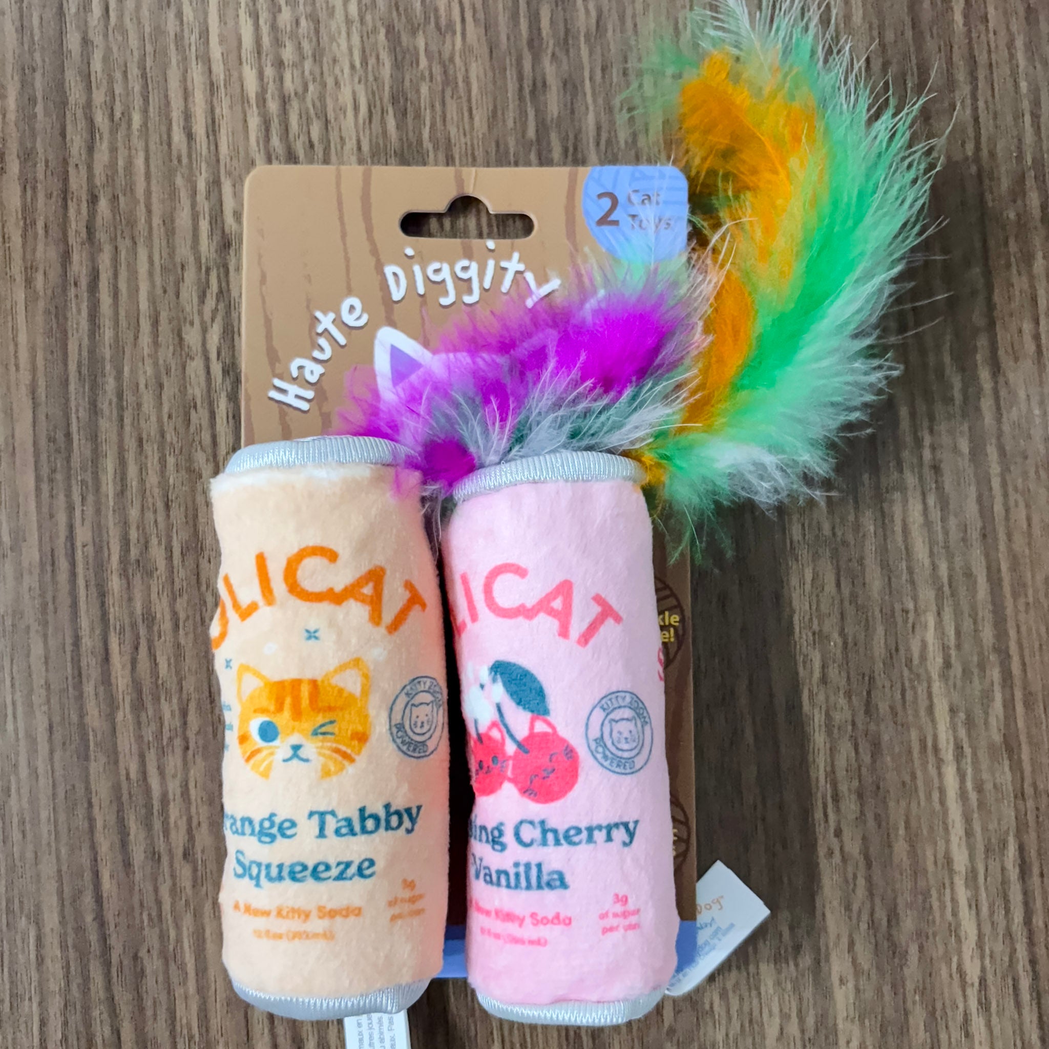 A refreshing twist on playtime! This set of two plush cat toys, inspired by your favorite fizzy treats, features organic catnip and fluttery feathers for endless feline fun. The Chasing Cherry Vanilla and Orange Tabby Squeeze duo is the perfect way to keep your kitty entertained—no sugar, just pure playtime delight!