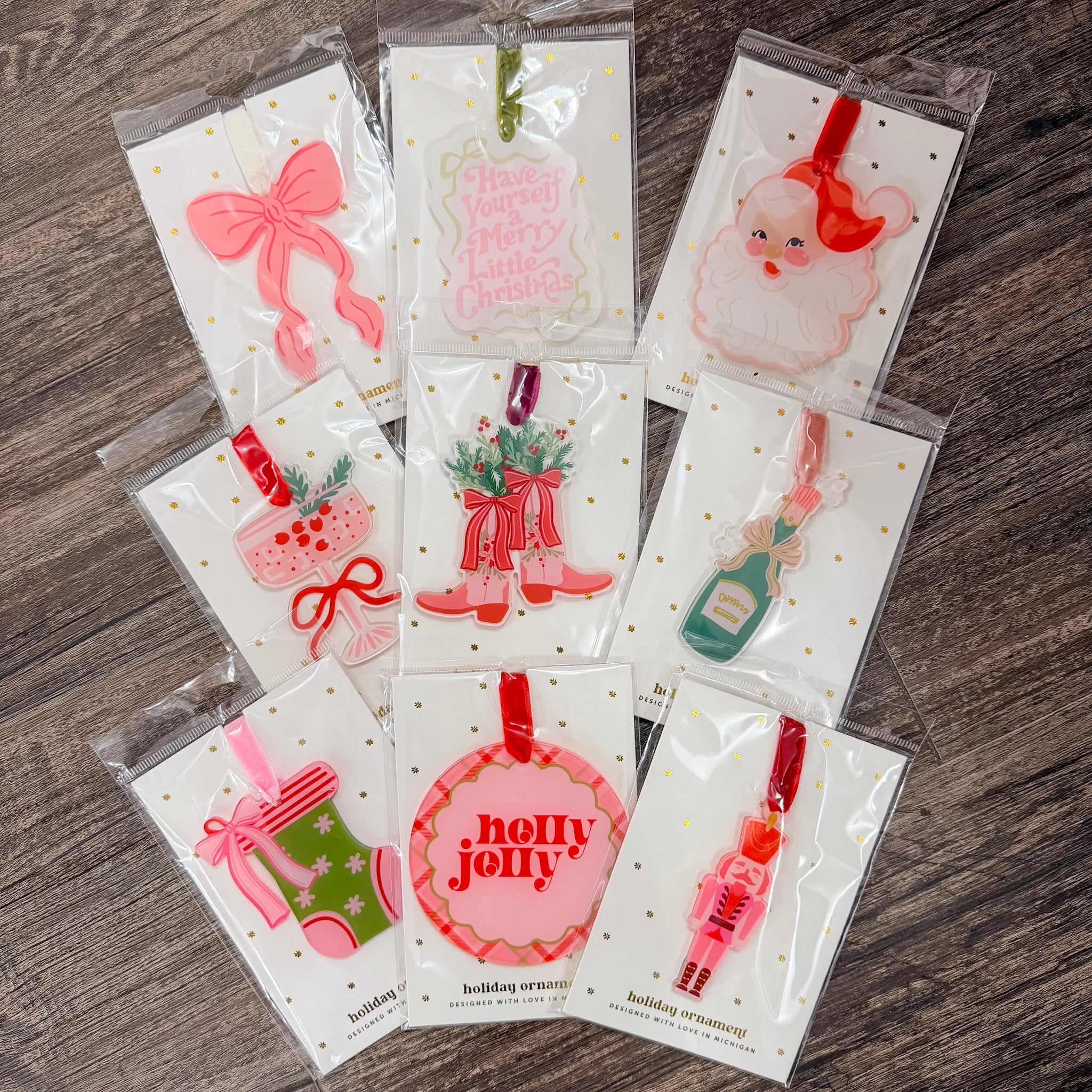 This super cute Acrylic Tree Ornament is the perfect addition to your festive decorations. Lightweight but durable, hang it on your tree or on the top of a gift with the included velvet string. A must-have for the holiday season!