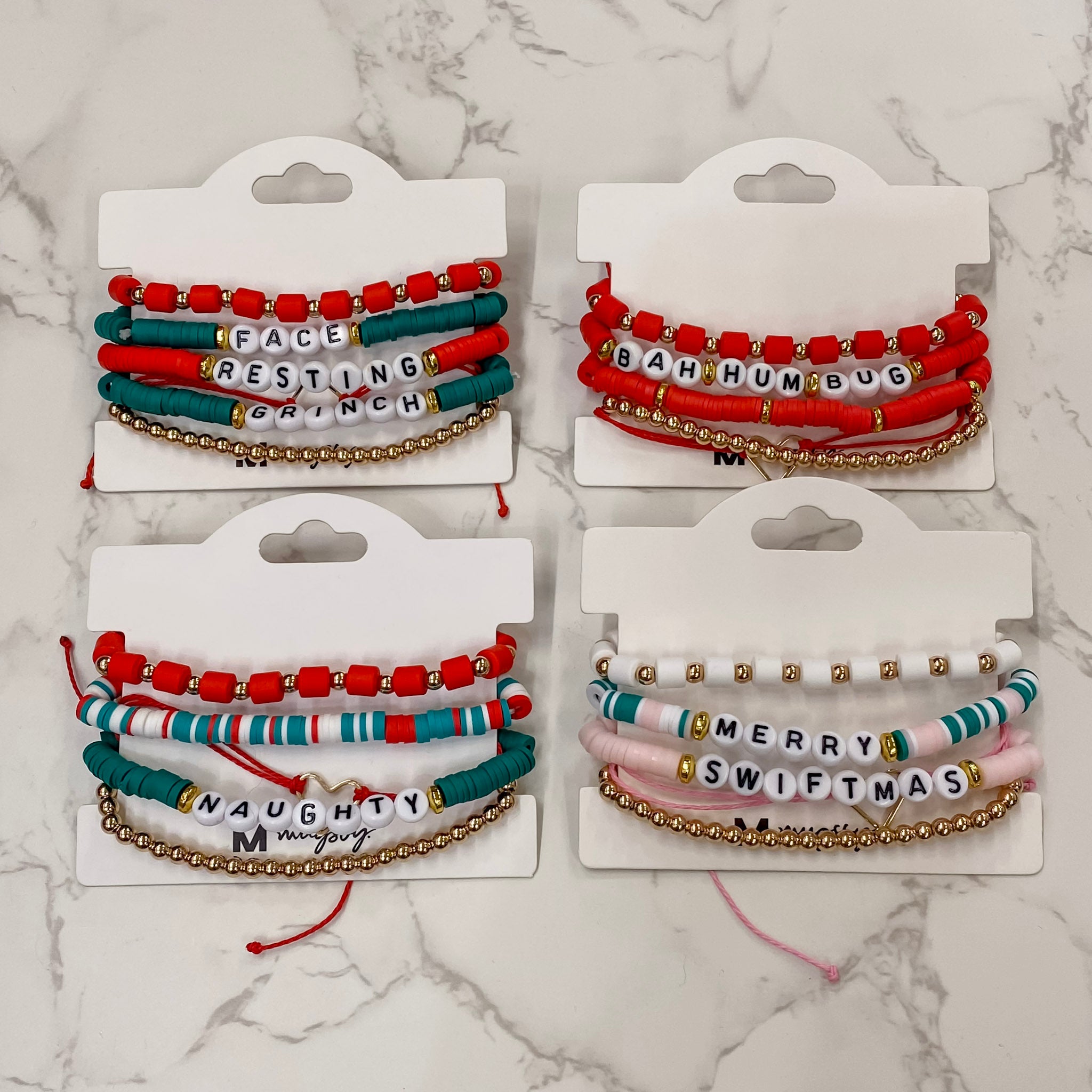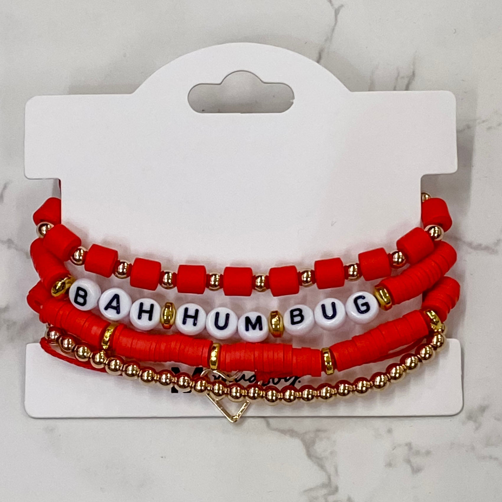 Add a touch of humor to your holiday look with this set of "Bah Humbug" bracelets. Perfect for the festive season.