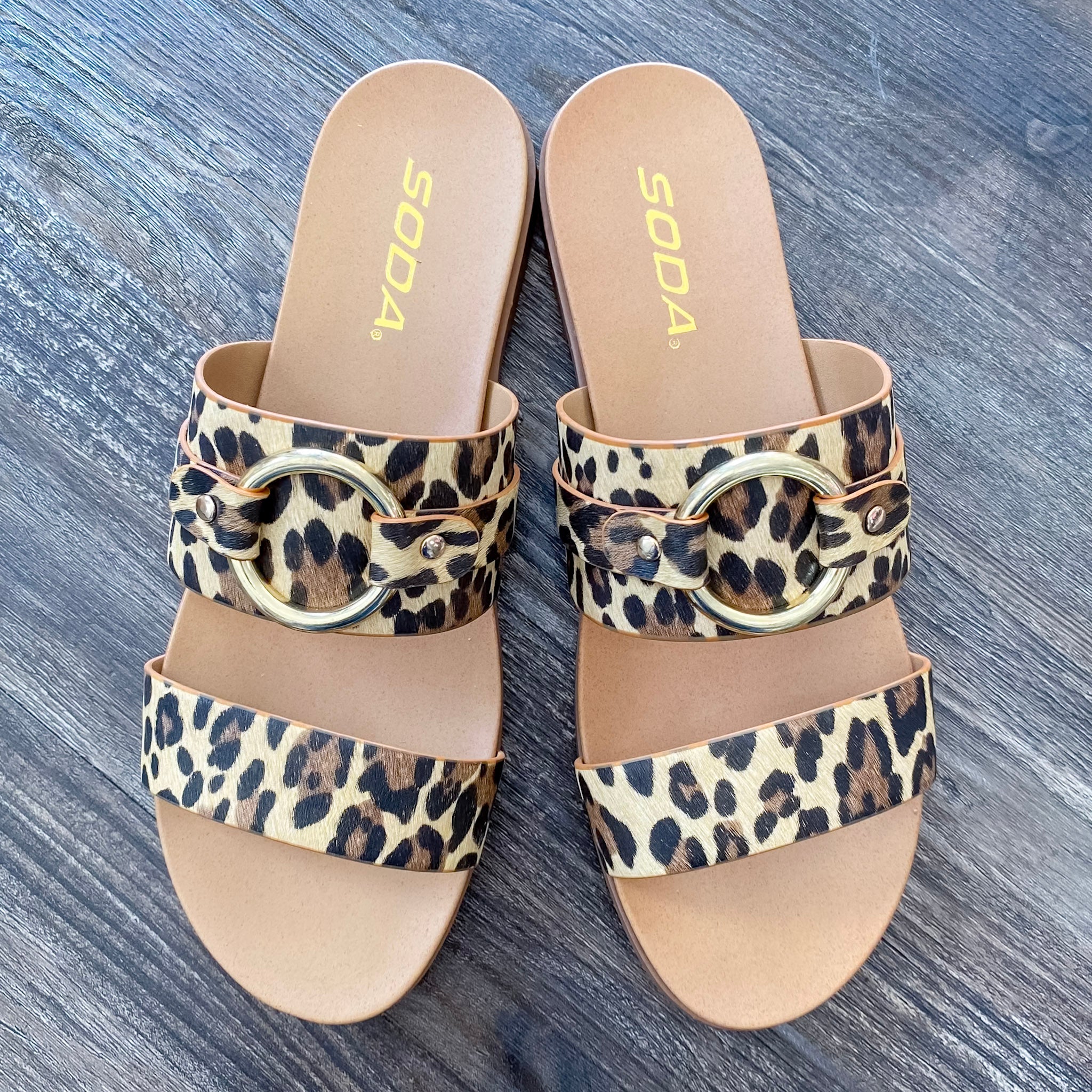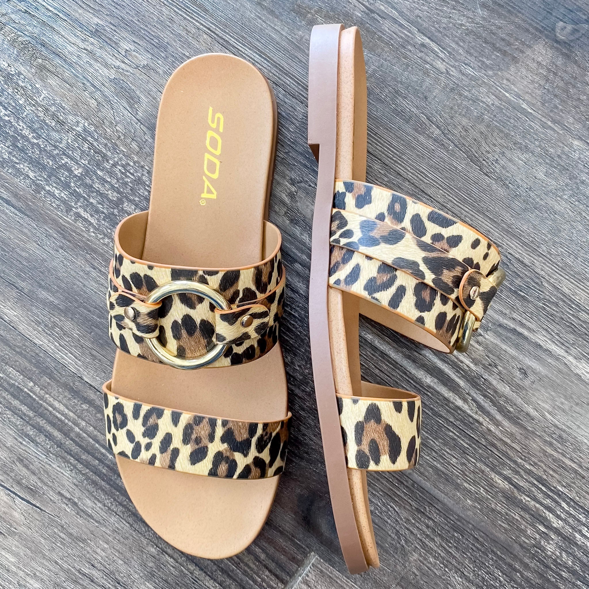 Unleash your wild side with these bold and stylish leopard-print flat sandals. Designed with a sleek dual-strap silhouette, these sandals feature a fierce faux animal print paired with a polished gold-tone circular buckle for a modern, fashion-forward finish. The open-toe design and cushioned footbed ensure comfort with every step, while the neutral brown base makes them easy to style with casual or elevated looks. Whether you're heading to brunch or strolling the boardwalk, these sandals add instant personality to any outfit.
