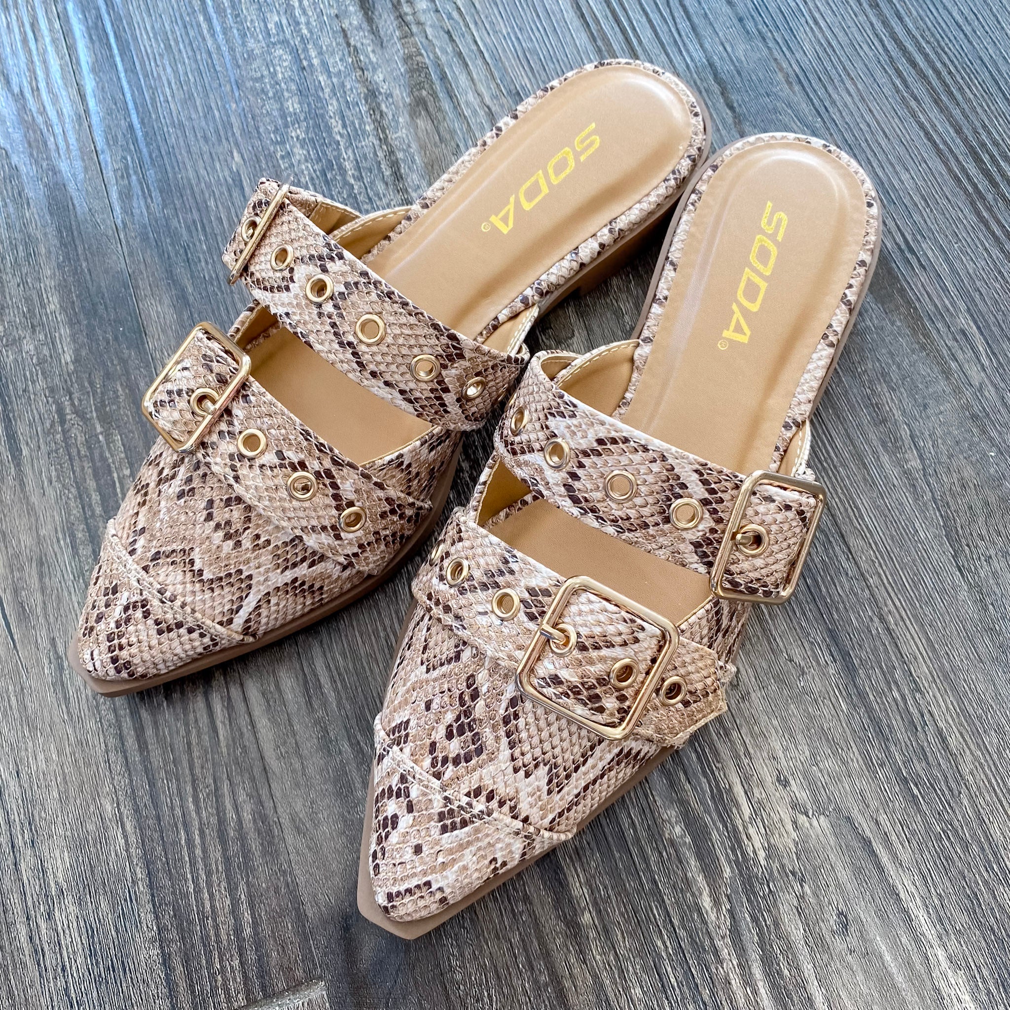 Make a bold statement with these fashion-forward snake print mules. Featuring a striking faux snakeskin finish in versatile beige tones, these flats blend edgy style with everyday wearability. The pointed toe silhouette adds a touch of sophistication, while the dual strap design with metallic buckle and eyelet detailing creates a standout, structured look. Easy to slip on and off, these flat mules offer a modern take on a classic silhouette — perfect for elevating both casual and office-ready outfits.