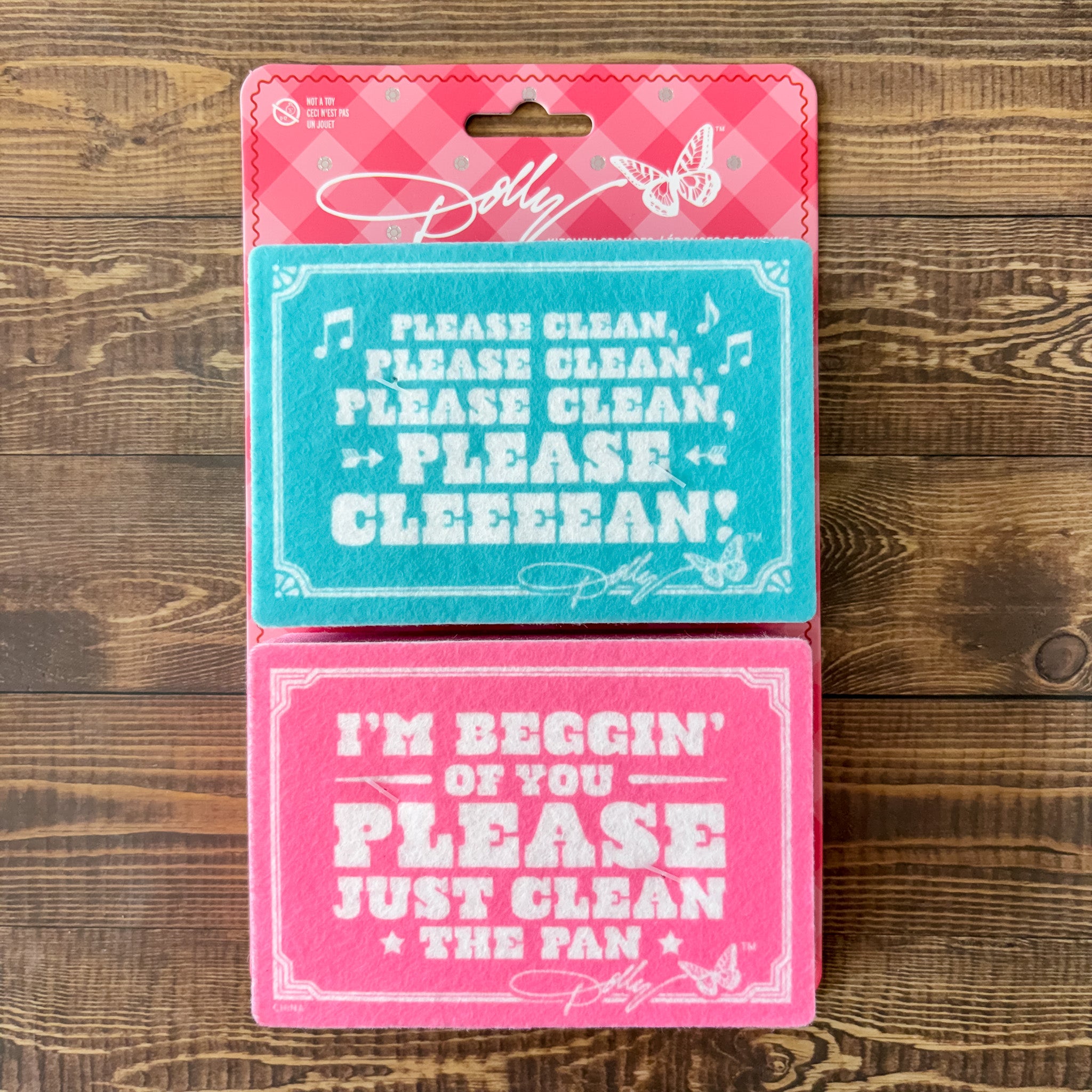 Is your sink begging for a Dolly-style rescue? This playful sponge duo riffs on “Jolene” with parody lyrics so catchy you’ll find yourself singing while you scrub. Each 4.3" x 3" sponge is made with three hardworking layers and adorned with Dolly’s signature logo. Packed on a pink gingham backer with foil-stamped rhinestones, they’re perfect for gifting or everyday use.