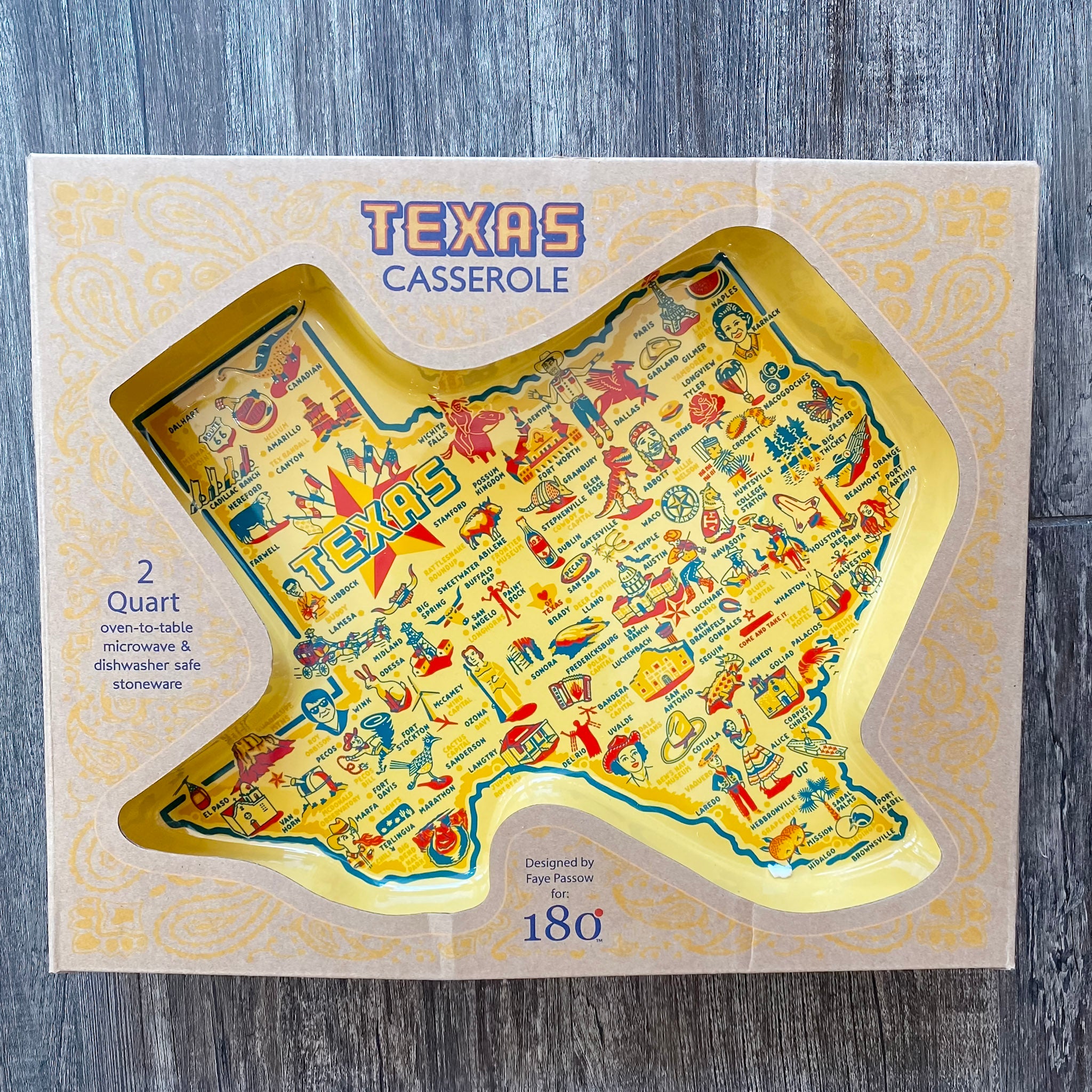 This is a large oven-to-table stoneware that is both dishwasher and microwave safe. Great hosting staple! It is a bright yellow dish that has all the iconic Texas locations degisned in loads of color at the bottom of the dish. The dish itself is shaped like the state of Texas!