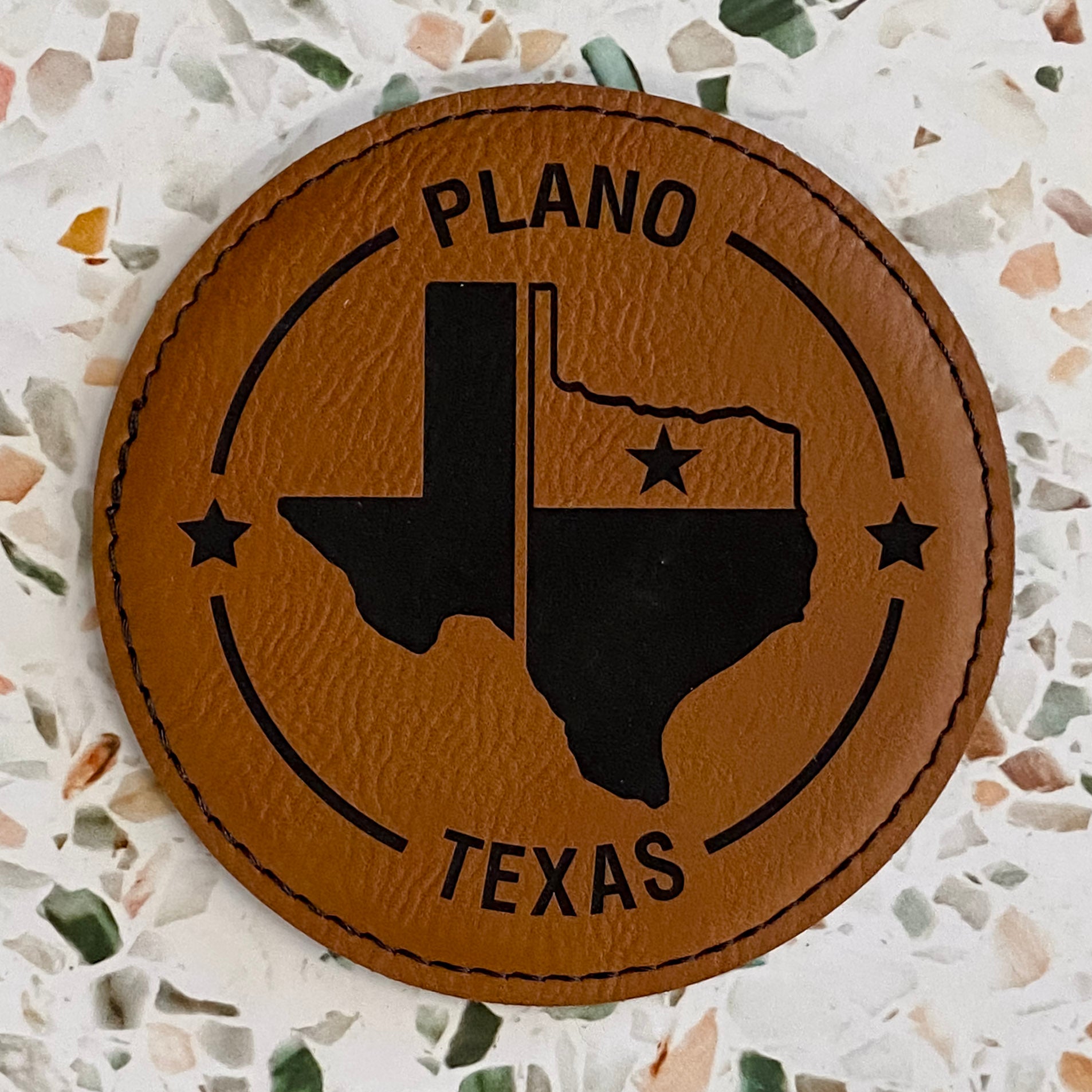 Leather coaster that reads "Texas-The Lone Star State" with the shape of the state of texas with the texas flag design within it. Great coaster to bring some texas love into your home.