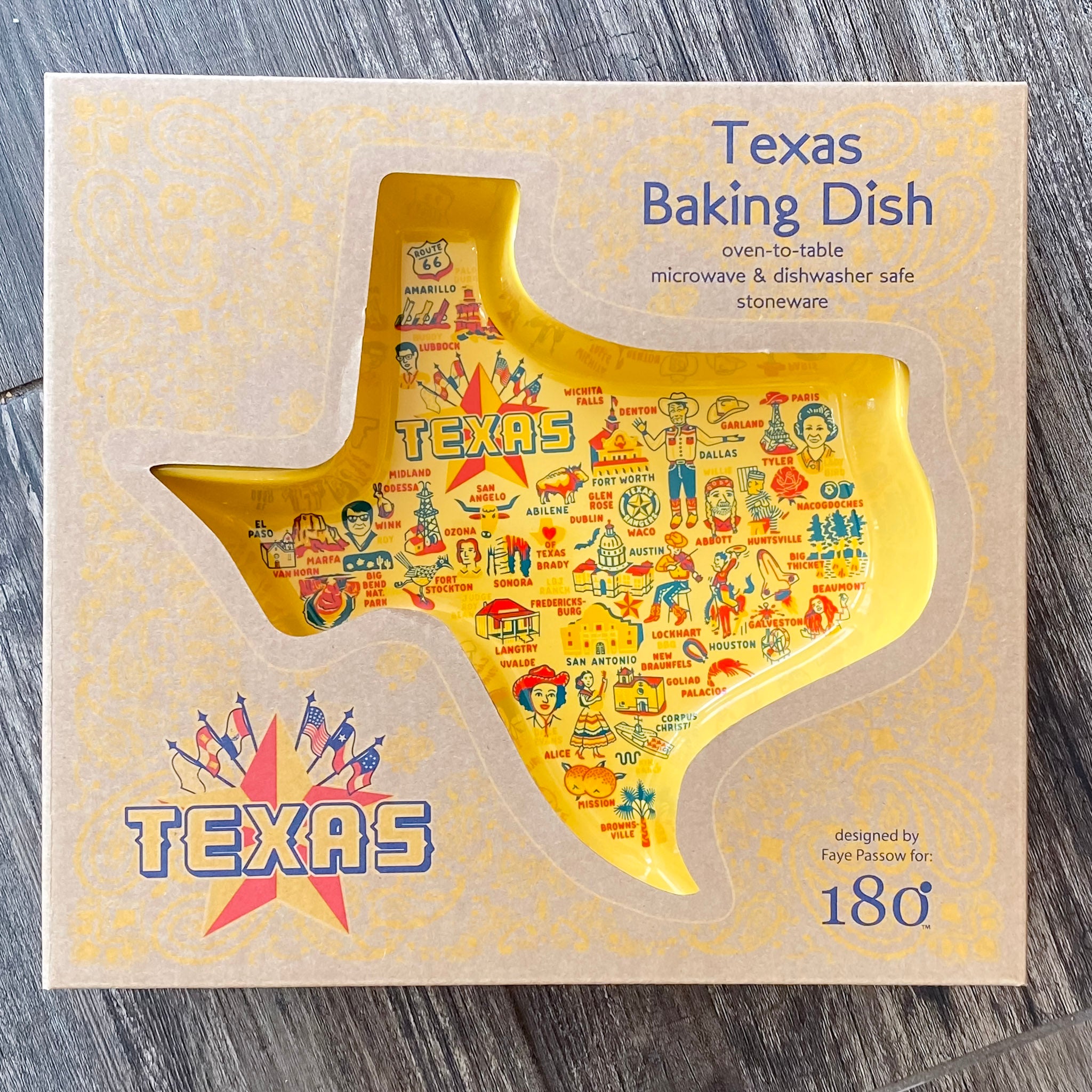 This is a small oven-to-table stoneware that is both dishwasher and microwave safe. Great hosting staple! It is a bright yellow dish that has all the iconic Texas locations degisned in loads of color at the bottom of the dish. The dish itself is shaped like the state of Texas!