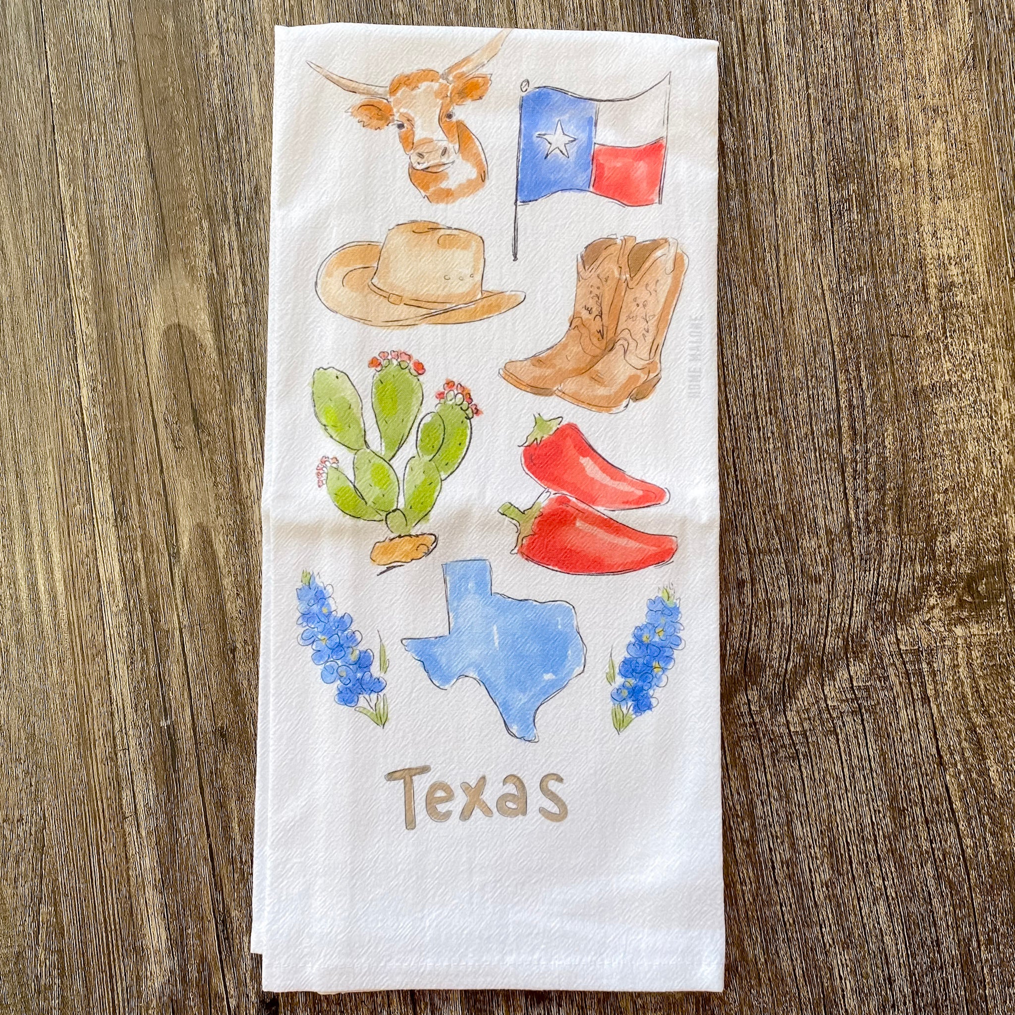 Add a little Lone Star flair to your kitchen with this Texas Icons Tea Towel, featuring a lively print of the state’s most iconic symbols. From cowboy boots and longhorns to bluebonnets, cacti, and the Texas flag, this towel celebrates everything big, bold, and uniquely Texan — all set against a clean white background.