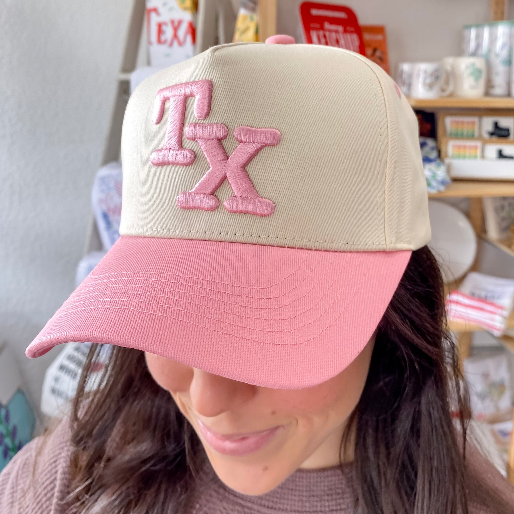 Such a cute hat for our Texas girls! This pink and cream canvas hat is a must-have for everyone! Goes with any outfit! TX is embroidered! Features an adjustable snapback for the perfect fit every time.