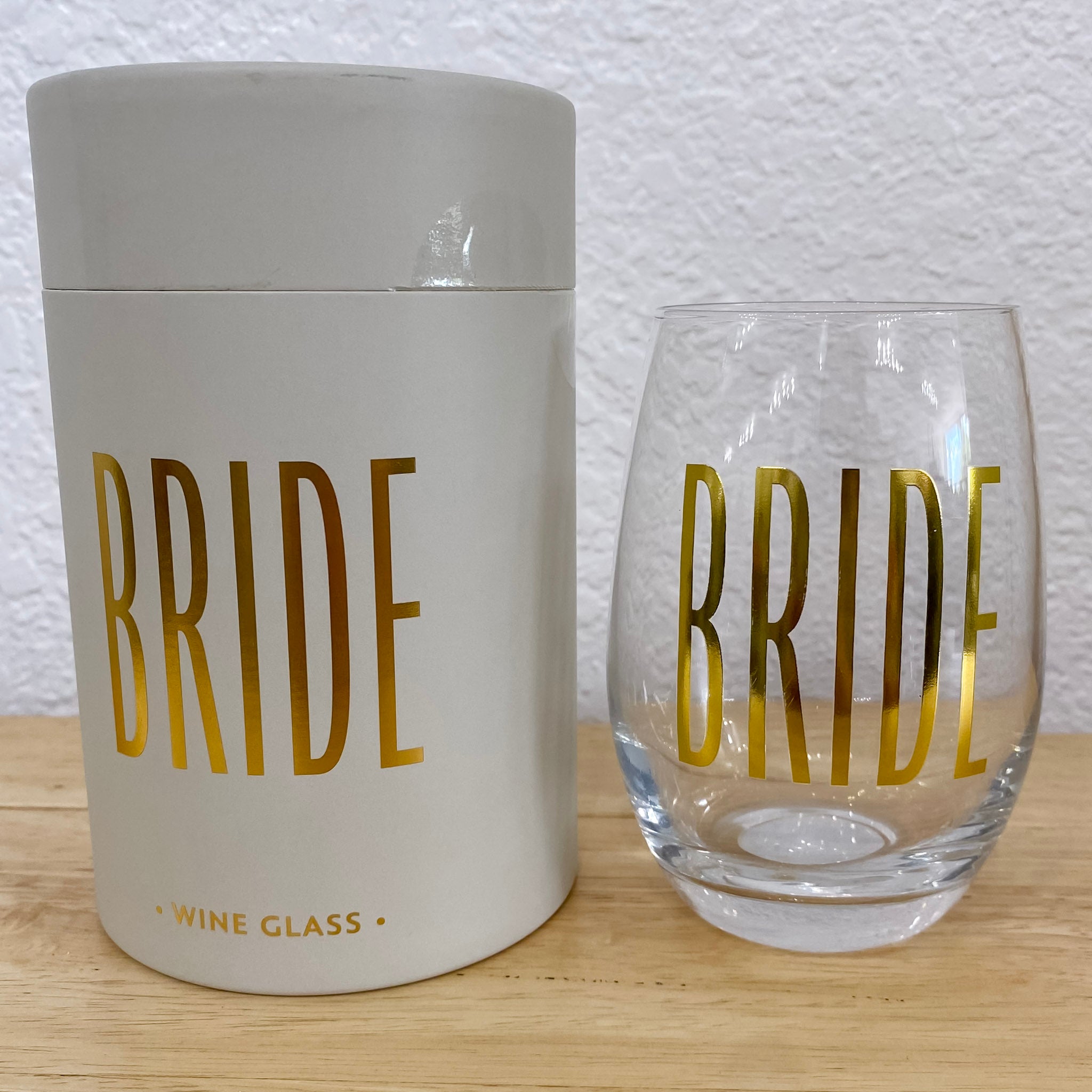 - Glass reads "Bride" phrase in gold foil