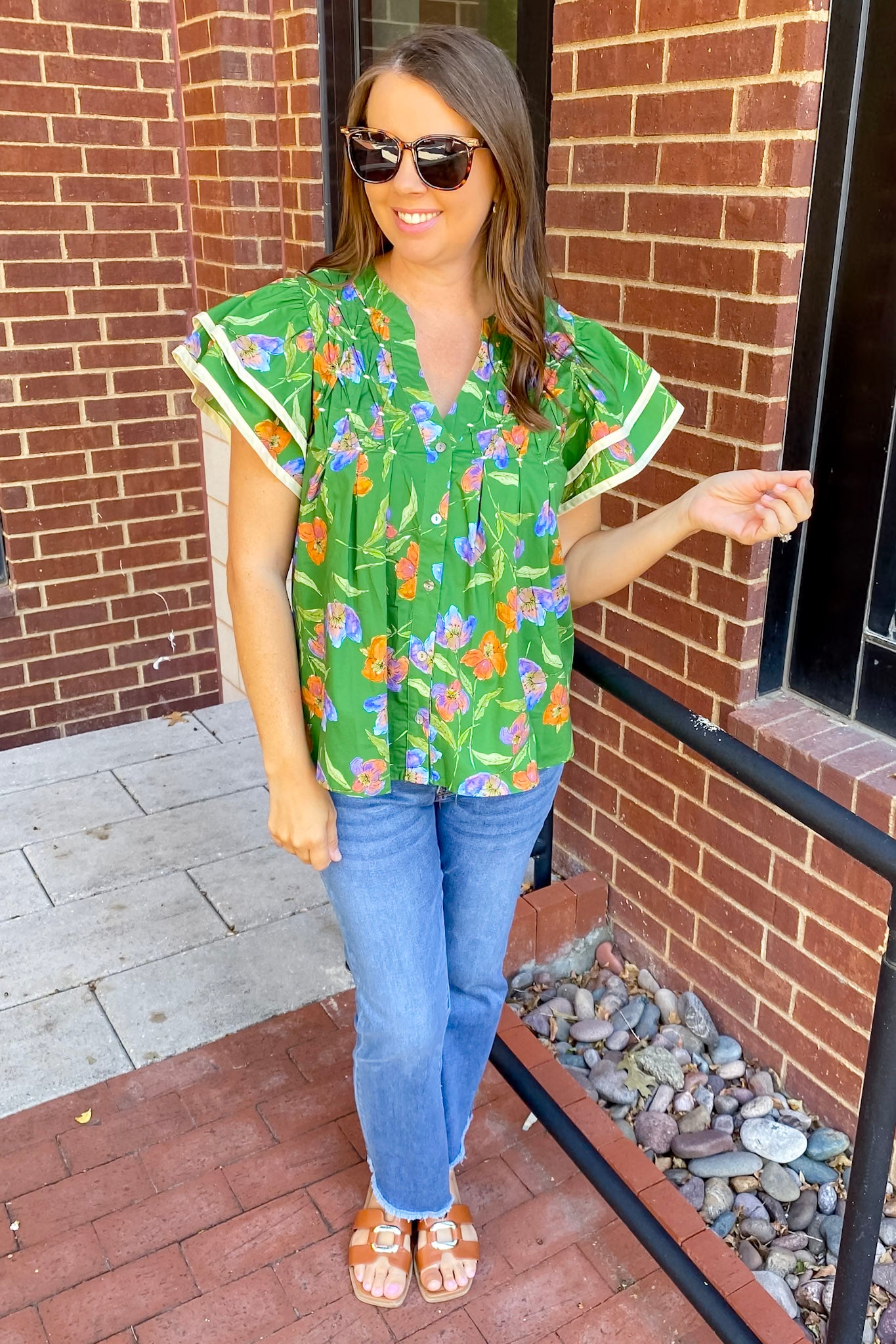 This top is giving sweet meets statement! With layered flutter sleeves trimmed in cream, delicate pintuck detailing at the shoulders, and a playful floral print in pumpkin orange and periwinkle blue—this button-front blouse is the perfect way to add a soft, feminine pop to your fall wardrobe. The lightweight feel makes it easy to wear now and layer later.