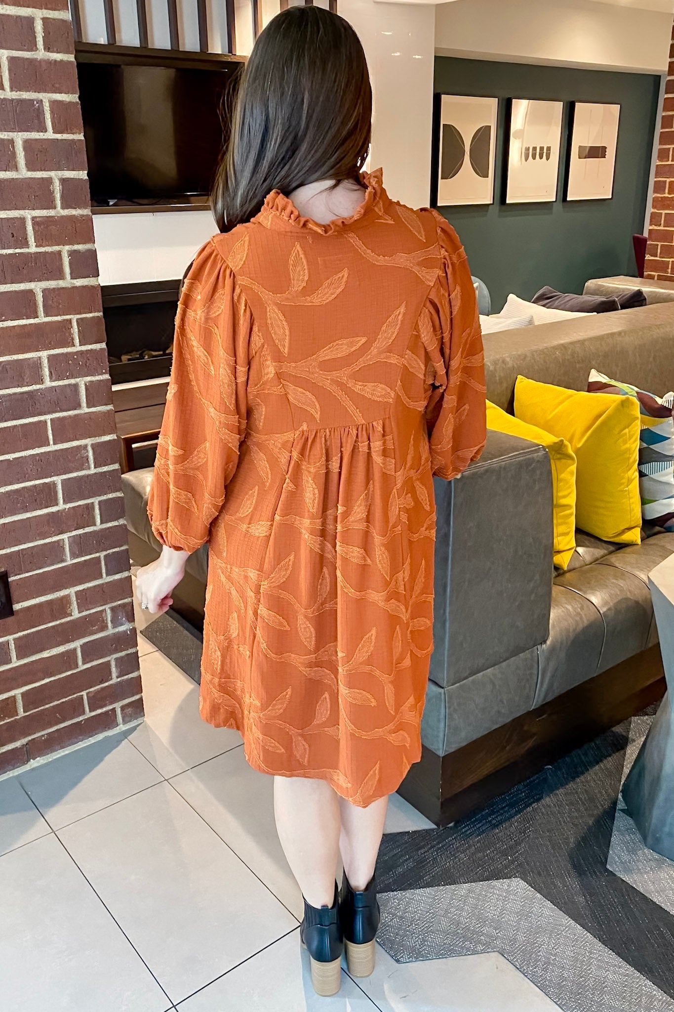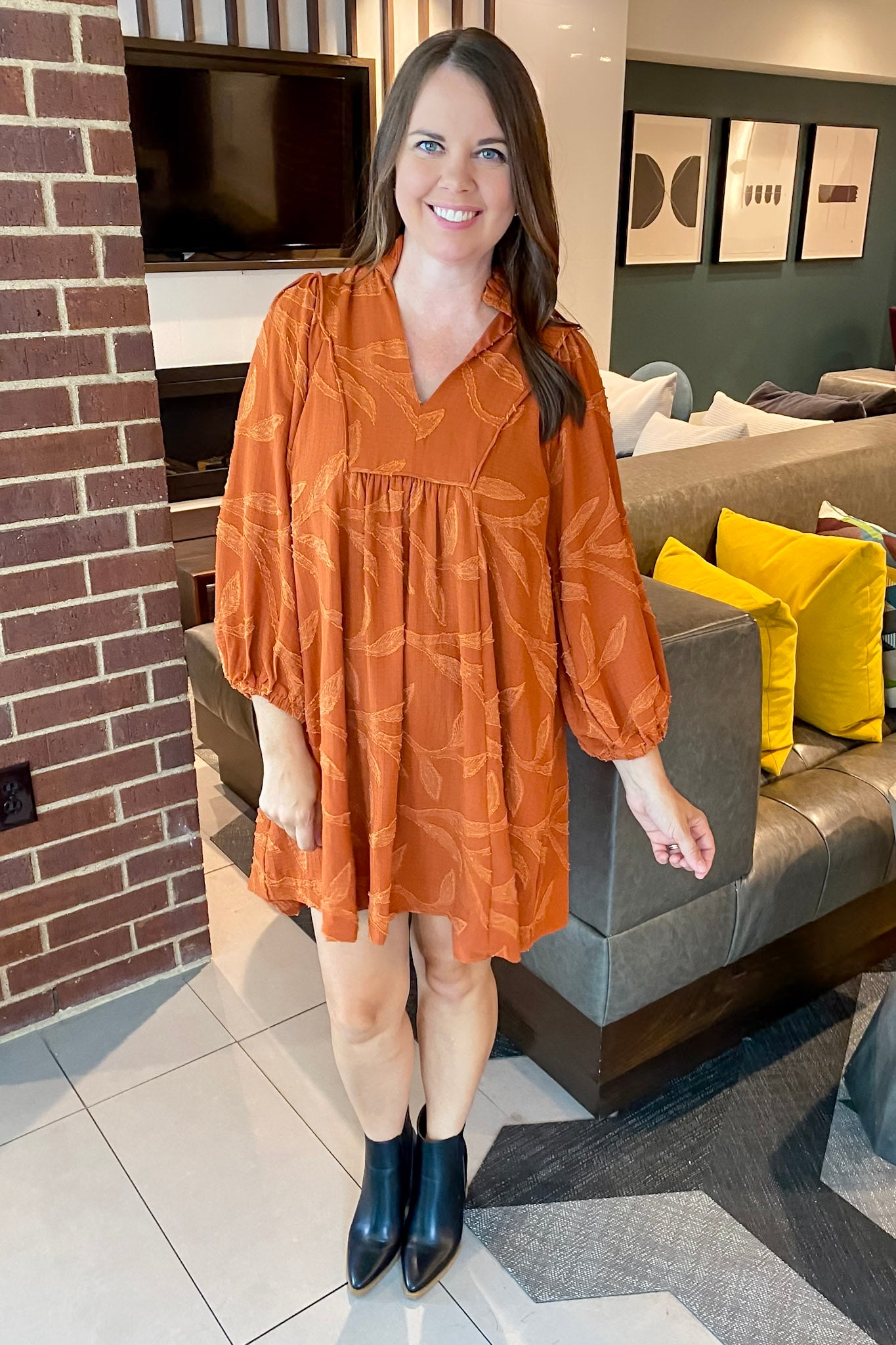 A customer favorite for a reason! This rust-toned babydoll dress is made for fall days that call for comfort and compliments. The soft textured fabric features subtle stitched leaves, while the billowy sleeves and flirty, flowy silhouette make it a go-to for everything from cozy afternoons to casual nights out. Lightweight, breathable, and ultra flattering—it’s the fall dress you’ll reach for again and again.