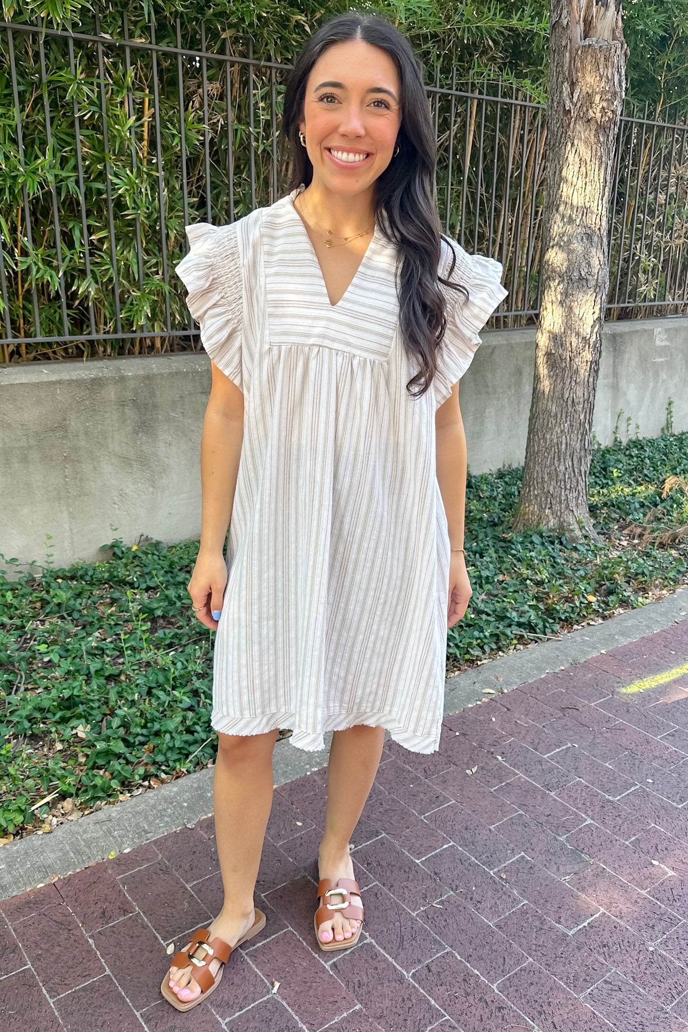 Soft, swingy, and oh-so-sweet, this mocha-striped dress brings just the right amount of cozy playfulness to your fall wardrobe. With fluttery ruffle sleeves, subtle stripes, and an easy fit, it’s made for twirling through crisp days with a latte in hand. The raw-edge hem gives it that effortless "just threw it on" feel—while still looking totally put-together.