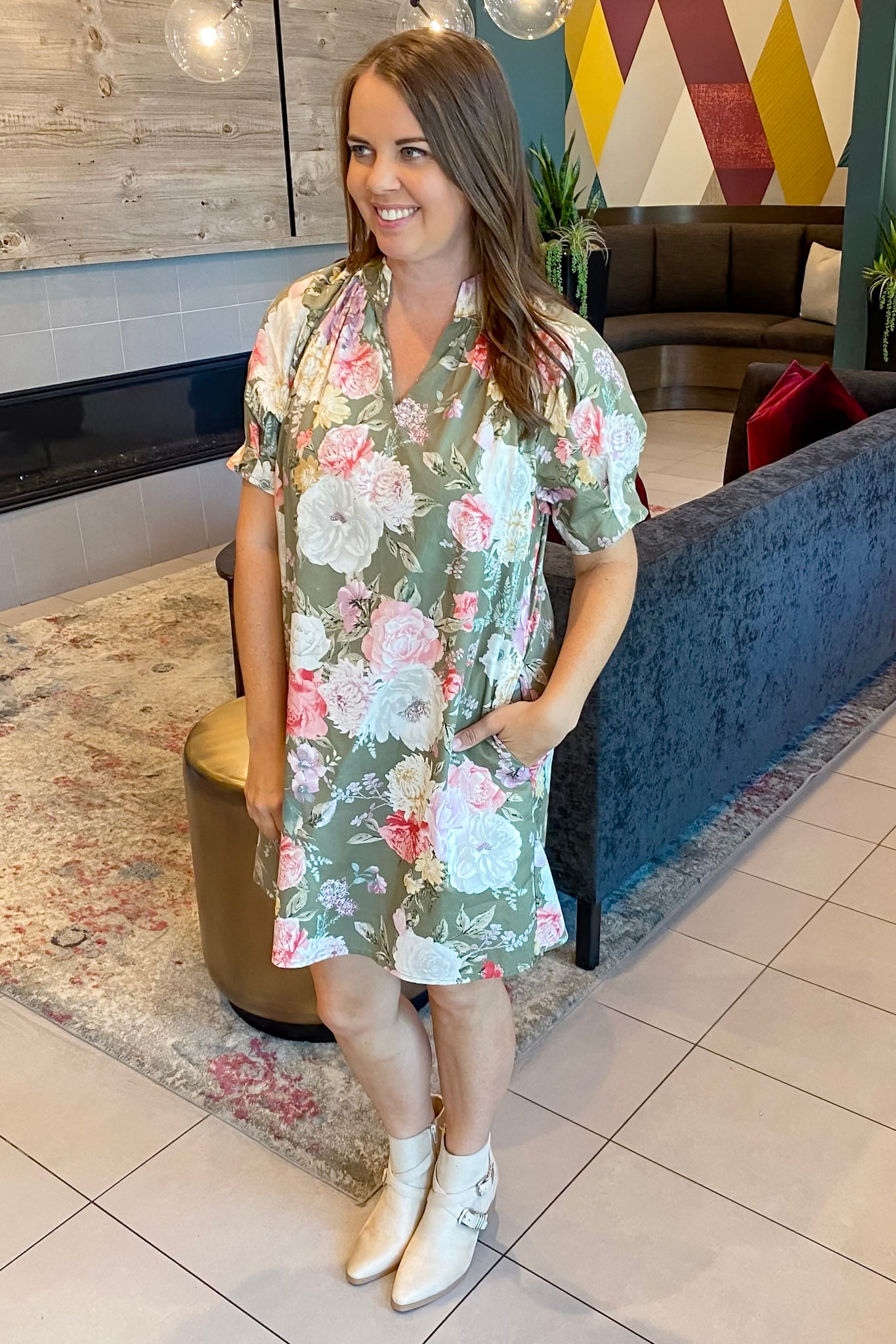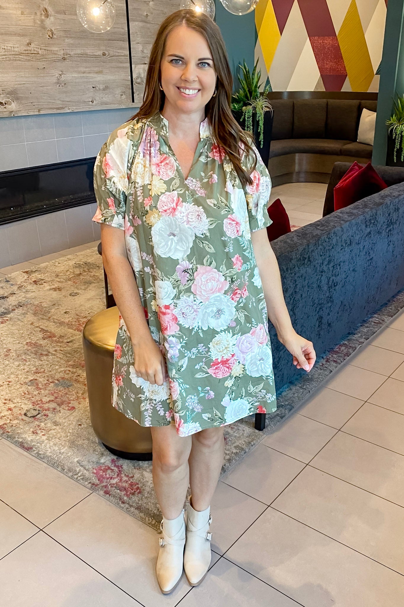 This sweet and stunning mini dress brings just the right blend of bold florals and easygoing fall flair. The olive green base is the perfect canvas for soft blush, ivory, and lilac-toned florals, giving it a romantic feel without being too fussy. Featuring a relaxed fit, subtle pleating at the neckline, and short sleeves, it’s the throw-on-and-go dress that still makes you feel put-together.