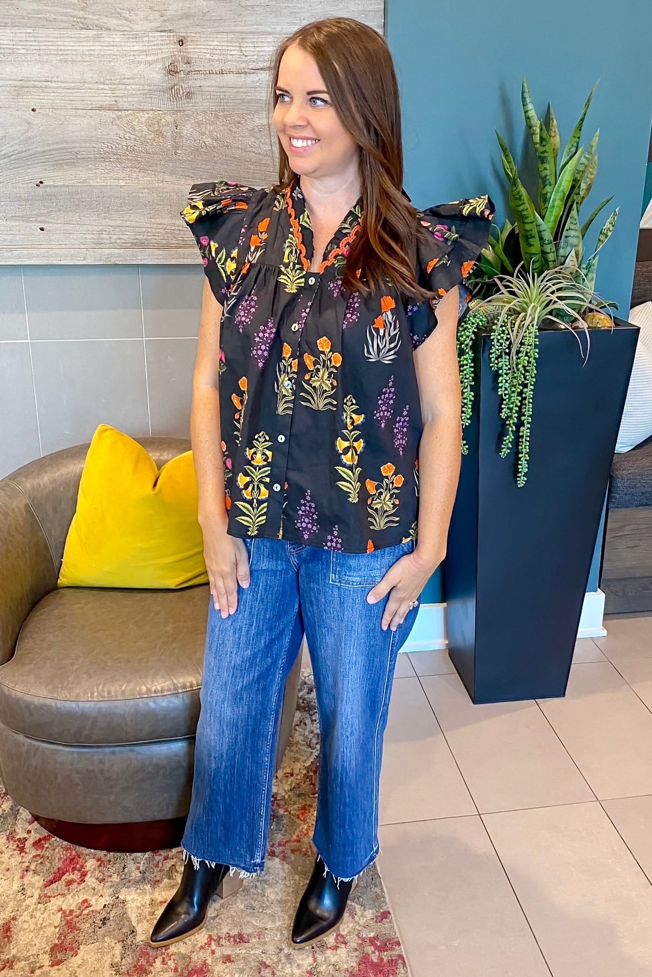 Give your wardrobe a cheerful update with the Flow Is Good Black Floral Print Top. This playful piece features a breezy, button-down silhouette with vibrant floral illustrations in autumn tones. The standout detail? Layered ruffle sleeves that add just the right amount of flutter and flair. A ruffled collar with red stitched trim frames the neckline for that perfect touch of texture, making it equal parts fun and feminine.