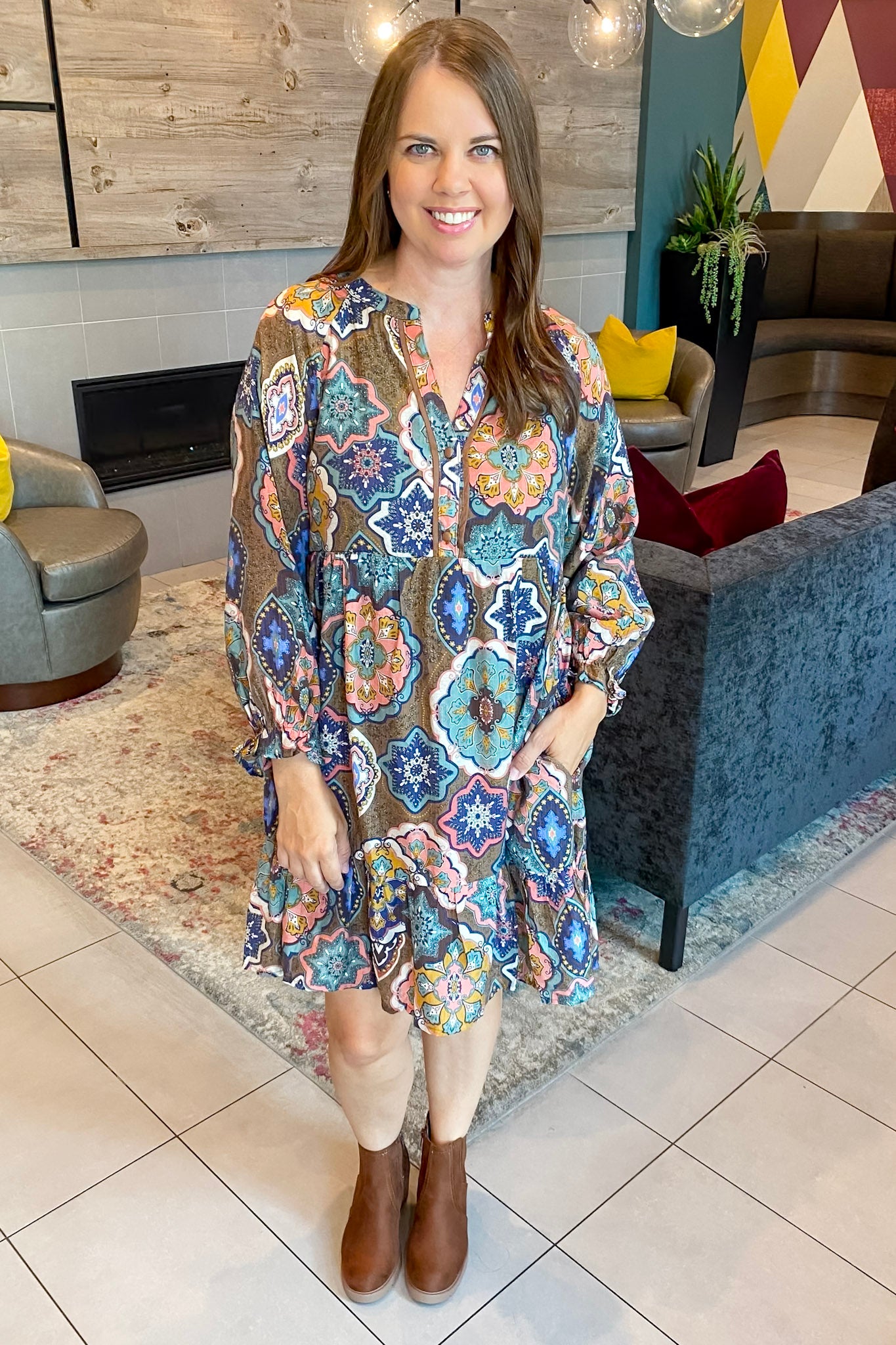 This swingy little number is made for crisp fall days and weekend plans. With a flattering v-neckline, breezy sleeves, and an easy tiered fit, this dress is both effortless and eye-catching. The bold brown-toned print adds just enough color without being over the top, and the lightweight fabric makes it perfect for layering as the weather cools.