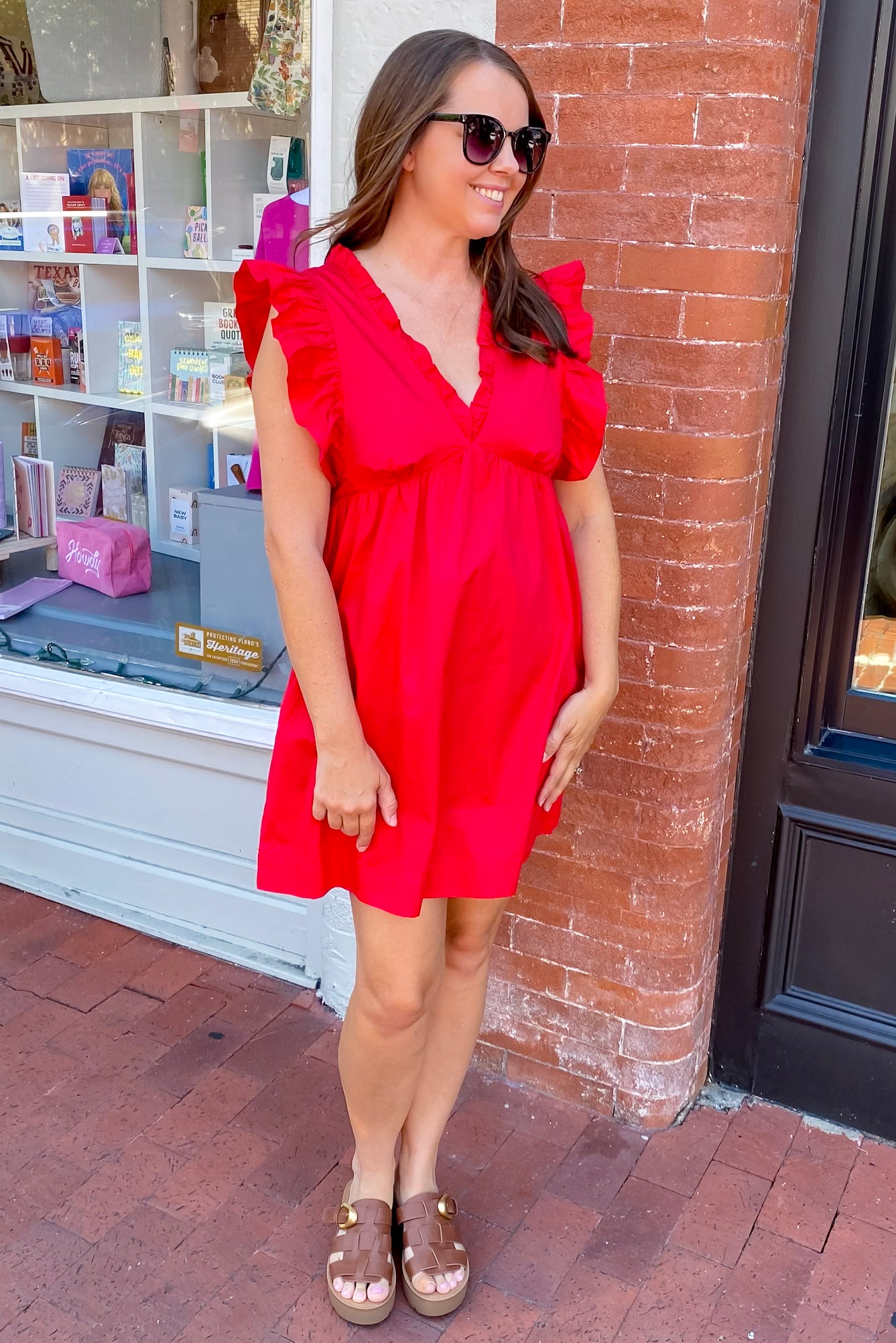Turn heads in The Fresh Air Ruffle Detail Red Dress—a bold little number that brings just the right amount of sass and sweetness. With a flouncy ruffled neckline, flutter sleeves, and a twirl-worthy A-line silhouette, this red-hot dress is your go-to for when you want to feel fun, flirty, and totally unstoppable. Lightweight with a comfy fit, it’s an instant confidence booster for all your fall festivities.