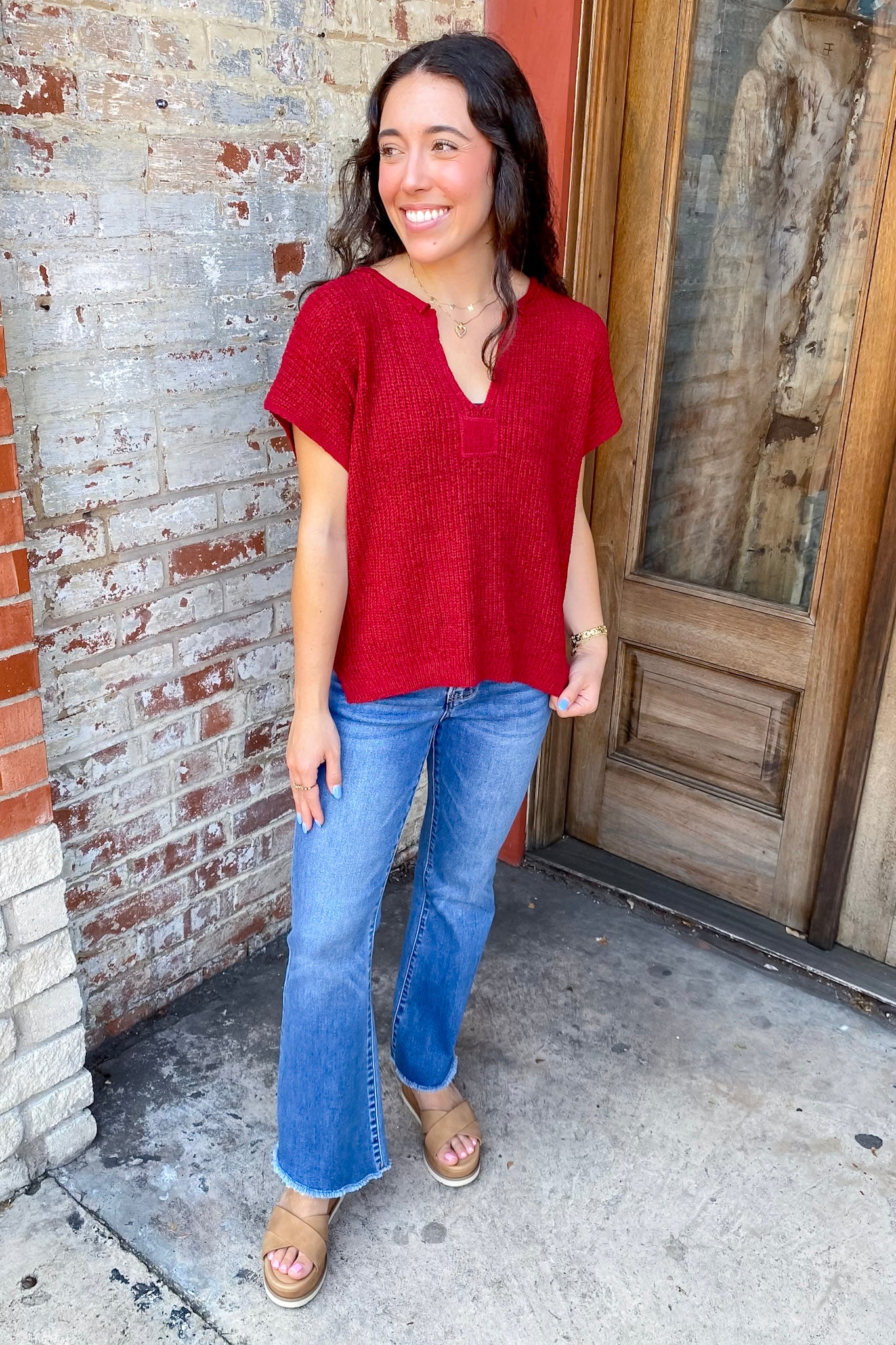 A breezy and lightweight knit, this deep red-colored cap sleeve top is perfect for warm days. The loose fit, textured fabric, and deep notched neckline add a relaxed yet stylish flair. The rich hue enhances its versatility, making it a great addition to your summer wardrobe.