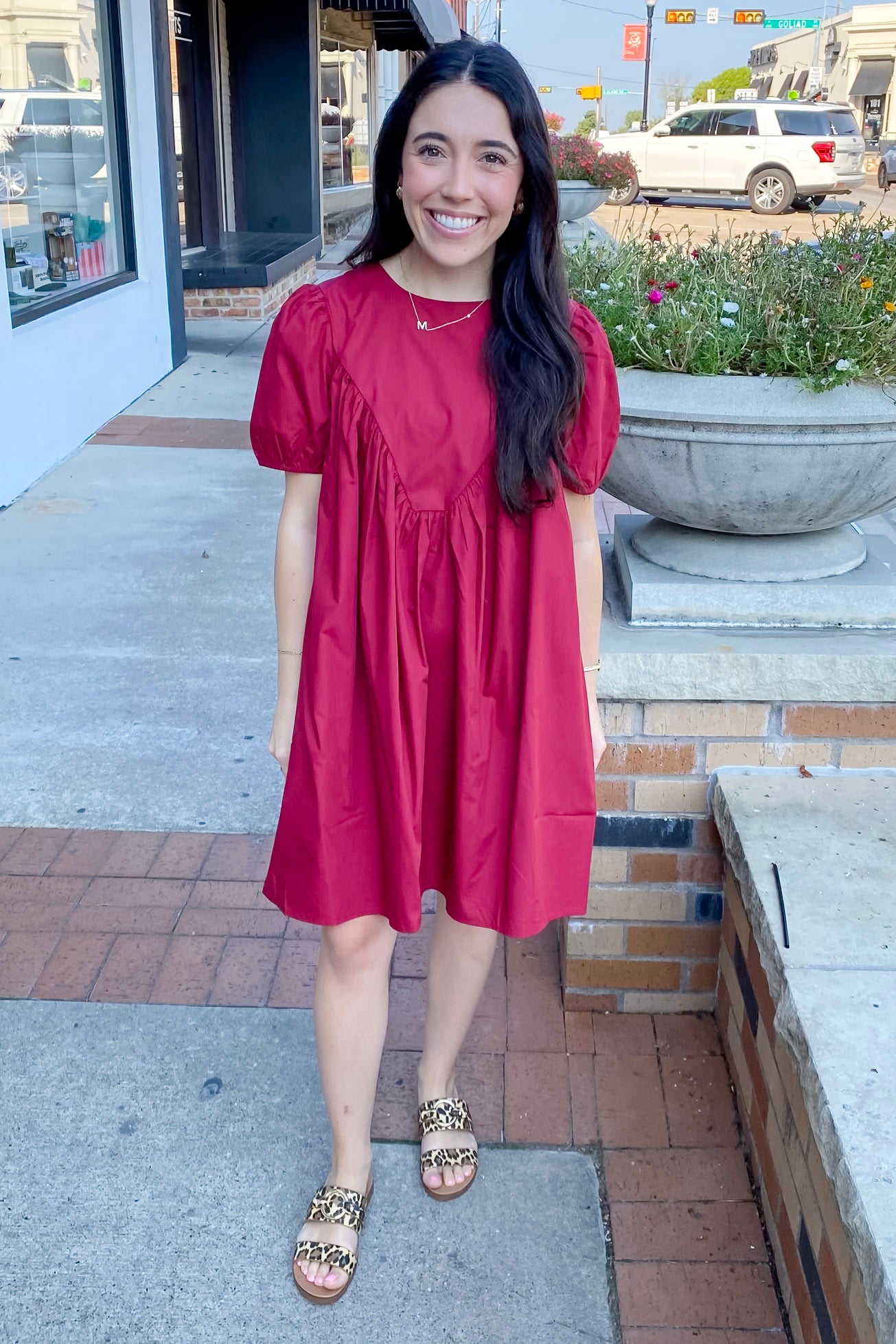 This deep red beauty brings effortless style with a touch of drama. The Good To Know Deep Red Dress features a structured, flowy silhouette with a flattering V-shaped gathered seam that adds movement and dimension. The puffed short sleeves bring in that boutique-worthy sweetness, while the rich pine green hue makes it the perfect canvas for layering accessories or letting it shine on its own.