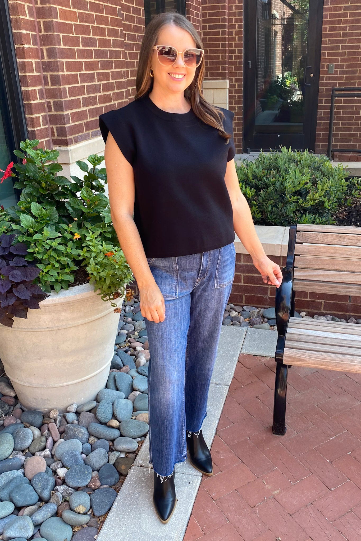 This sleeveless knit top in black is your fall wardrobe's secret weapon—simple, structured, and totally chic. With subtle shoulder padding and a soft, sweater-like texture, it brings just the right mix of polish and edge. It’s the kind of piece that elevates even your most laid-back days.