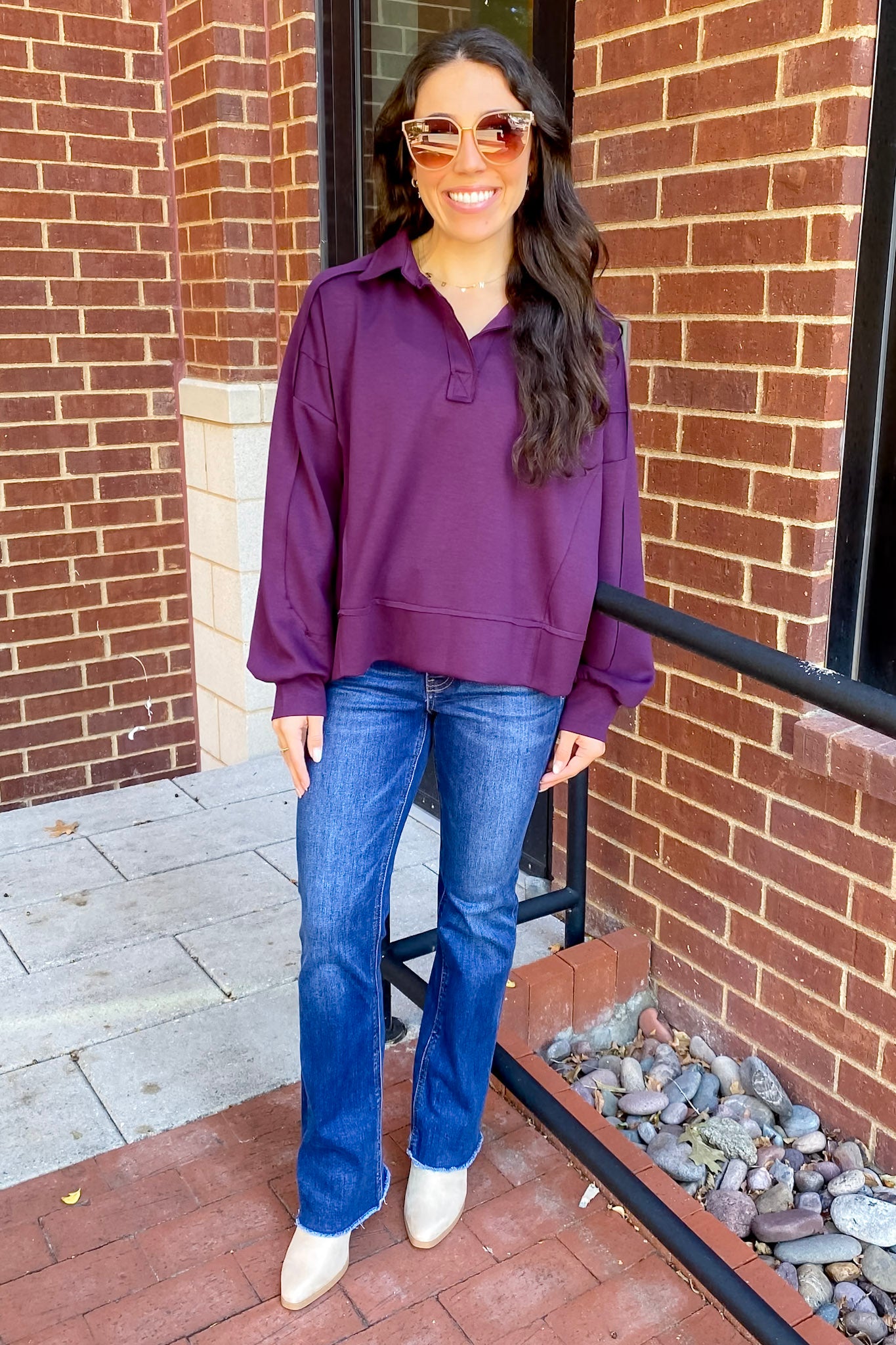 Effortlessly sporty with a punch of bold color, the I See You Longsleeve Collar Deep Plum Top is your everyday go-to for staying comfy while looking put-together. Featuring a relaxed fit, collar neckline with a partial button placket, and contrast stitch detail, this sweatshirt is made for fall layering. The purple plum hue adds a fun pop—perfect for brightening up cooler days.