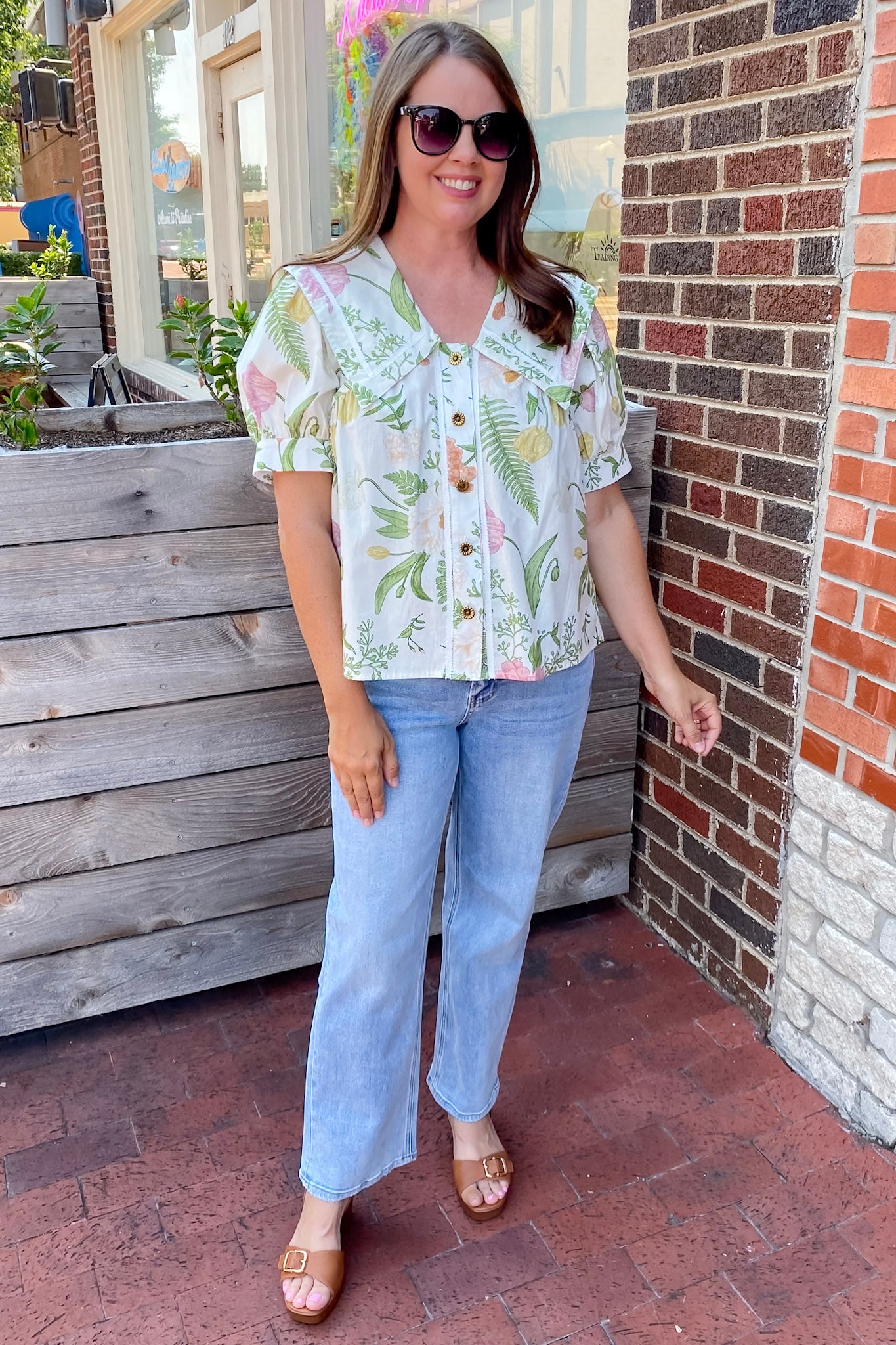 Sweet, soft, and effortlessly vintage—the Fern & Flounce Button-Up is here to steal your heart. With darling puff sleeves, botanical-inspired prints, and an oversized collar trimmed in sweet stitching, this cream top is your go-to for playful fall days. The antique-style buttons down the front add just enough personality, while the relaxed fit keeps things comfy-cute.