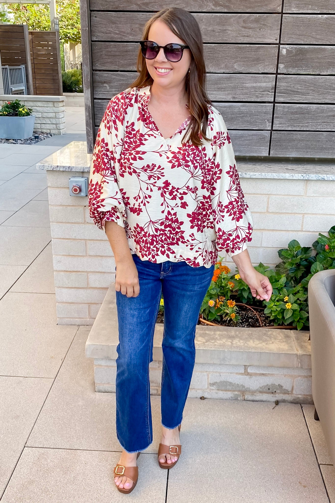 This garnet and cream floral blouse is fall perfection with its soft, flowy silhouette and playful scalloped hem. The relaxed fit and billowy sleeves keep it effortlessly chic, while the bold garnet print adds a touch of seasonal charm. Whether you dress it up or keep it casual, this top is a statement piece for autumn days.