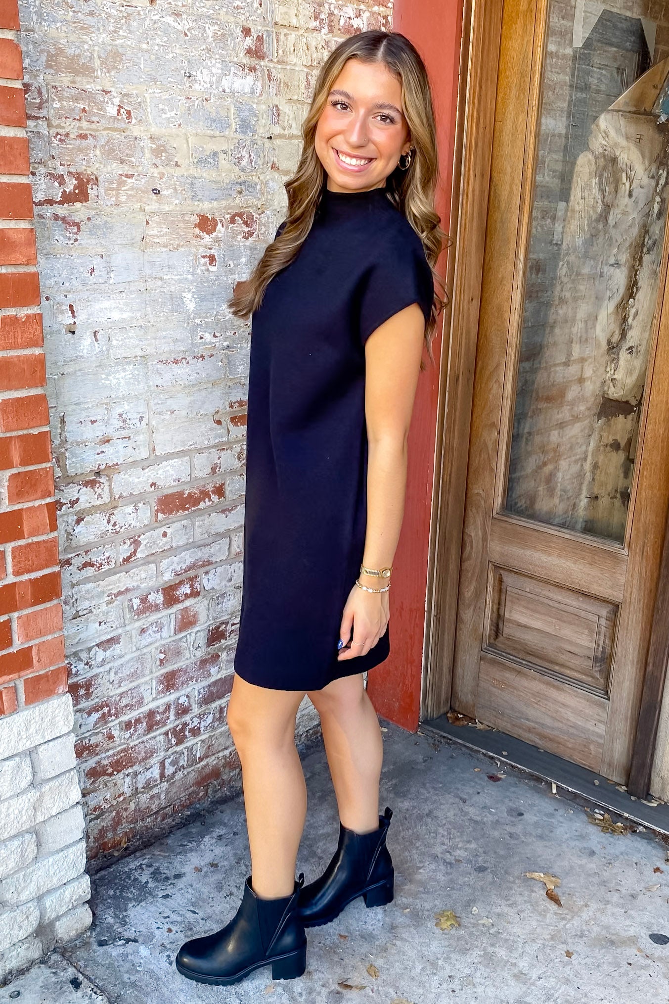 This black knit dress is all about effortless cool with just the right touch of structure. Designed with a relaxed, straight silhouette and soft, sweater-like texture, it’s a one-and-done piece that still feels totally put-together. The contrast striped sleeves bring a playful punch, while the mock neck keeps it sleek and fall-ready. Cozy enough for a chilly day, yet polished enough to style up, this dress is made for those “I want to be comfy but still cute” kind of days.