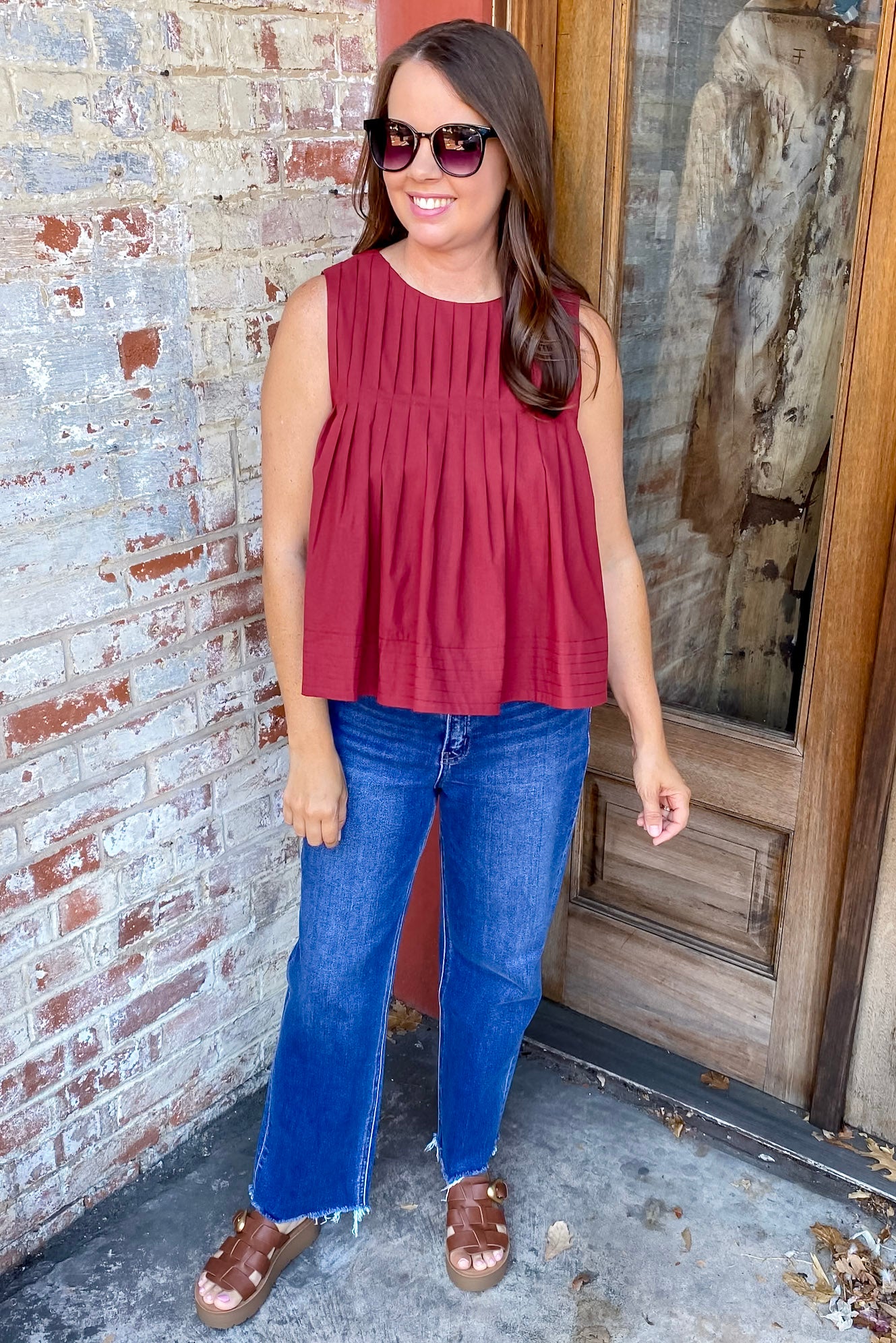 Game day ready and totally twirl-worthy! Like Me Now Pleated Burgundy Top brings volume, texture, and a touch of drama with its accordion-style pleating and flared silhouette. This deep cranberry burgundy hue is perfect for fall and flatters every skin tone. Sleeveless with a breezy fit, it layers beautifully under your favorite jackets when the temps drop. It’s lightweight, polished, and brings a little extra sass to your sideline look.