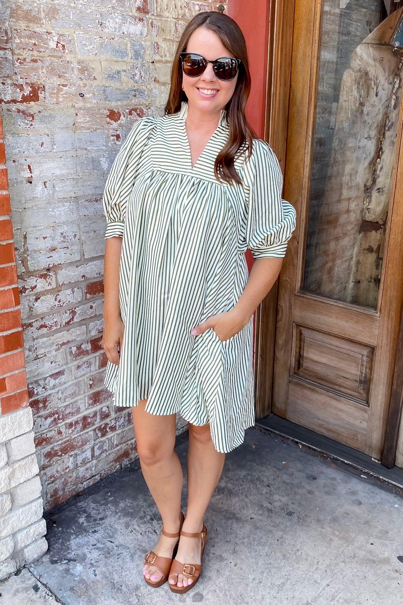 The Lucky To Have You Olive Striped Dress is the definition of comfy-cute! With crisp vertical stripes, a playful ruffle collar, and a relaxed flowy fit, this dress brings effortless polish with a side of fun. The puffed sleeves and deep pockets make it an easy fall go-to—just add accessories and you’re out the door looking adorable.
