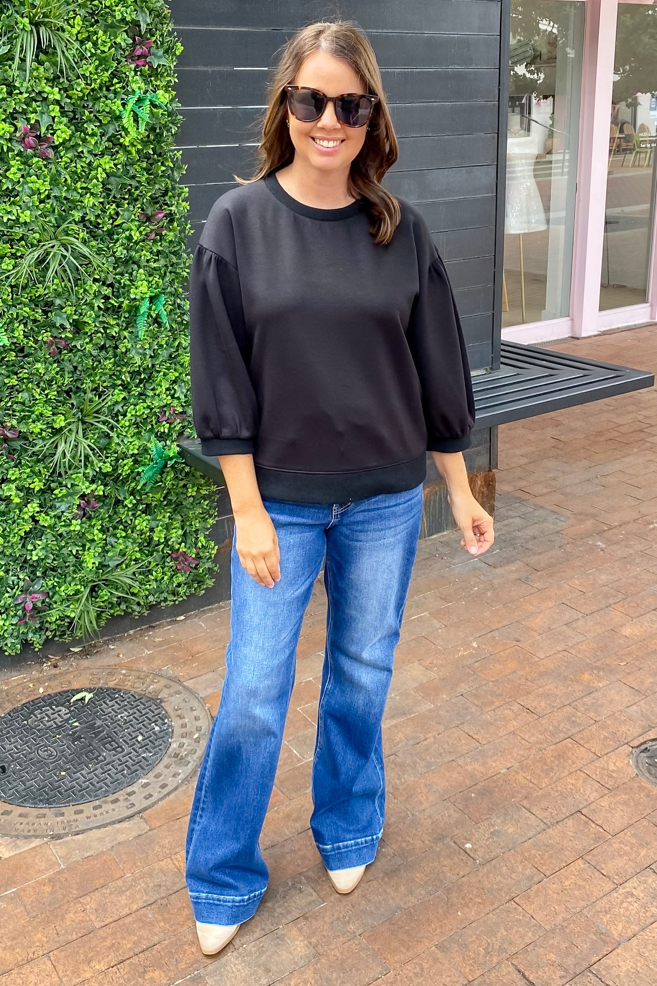 Make it Work with this Black top! This top features a solid sweatshirts top with U-neck, drop shoulder, three quarter peasant sleeves, and band cuffs! Make this your #OOTD
