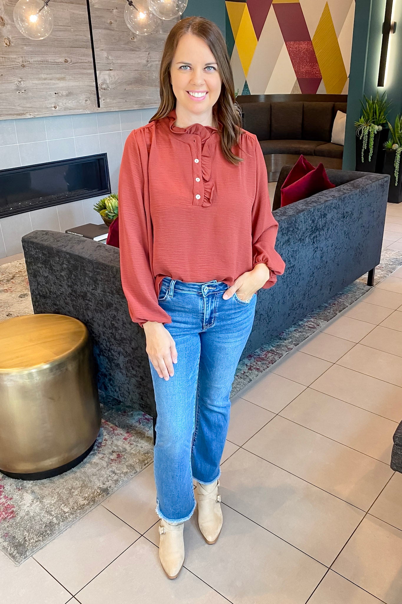 Spice up your winter wardrobe with the Make You Stay Button Detail Longsleeve Red Brown Top! This rich, rusty-red top is all about effortless elegance with its delicate ruffle-trimmed neckline and soft button-front detail. Billowy sleeves with elastic cuffs add a cozy yet feminine flair, and the lightweight fabric makes it easy to layer under cardigans or blazers. Whether you're headed to dinner or the office, this top adds just the right amount of flair to any look.
