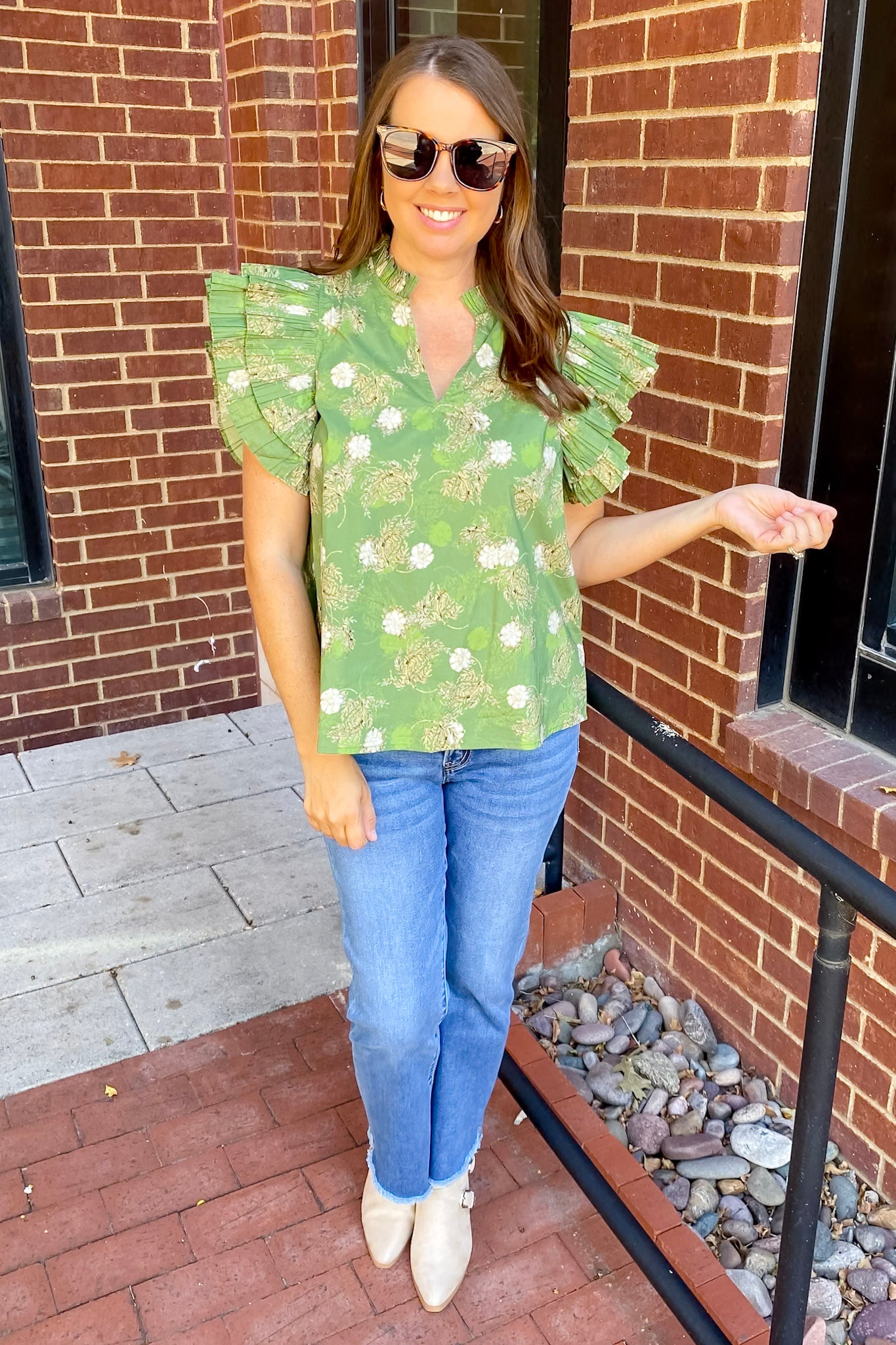 Bold and full of flair, this top brings all the drama in the best way. A rich green base sets the tone for delicate neutral florals, while those structured pleated sleeves steal the show. With a notch neckline and easy shape, it's the kind of statement top that feels just as good as it looks. It’s effortless, eye-catching, and made to turn heads this fall.