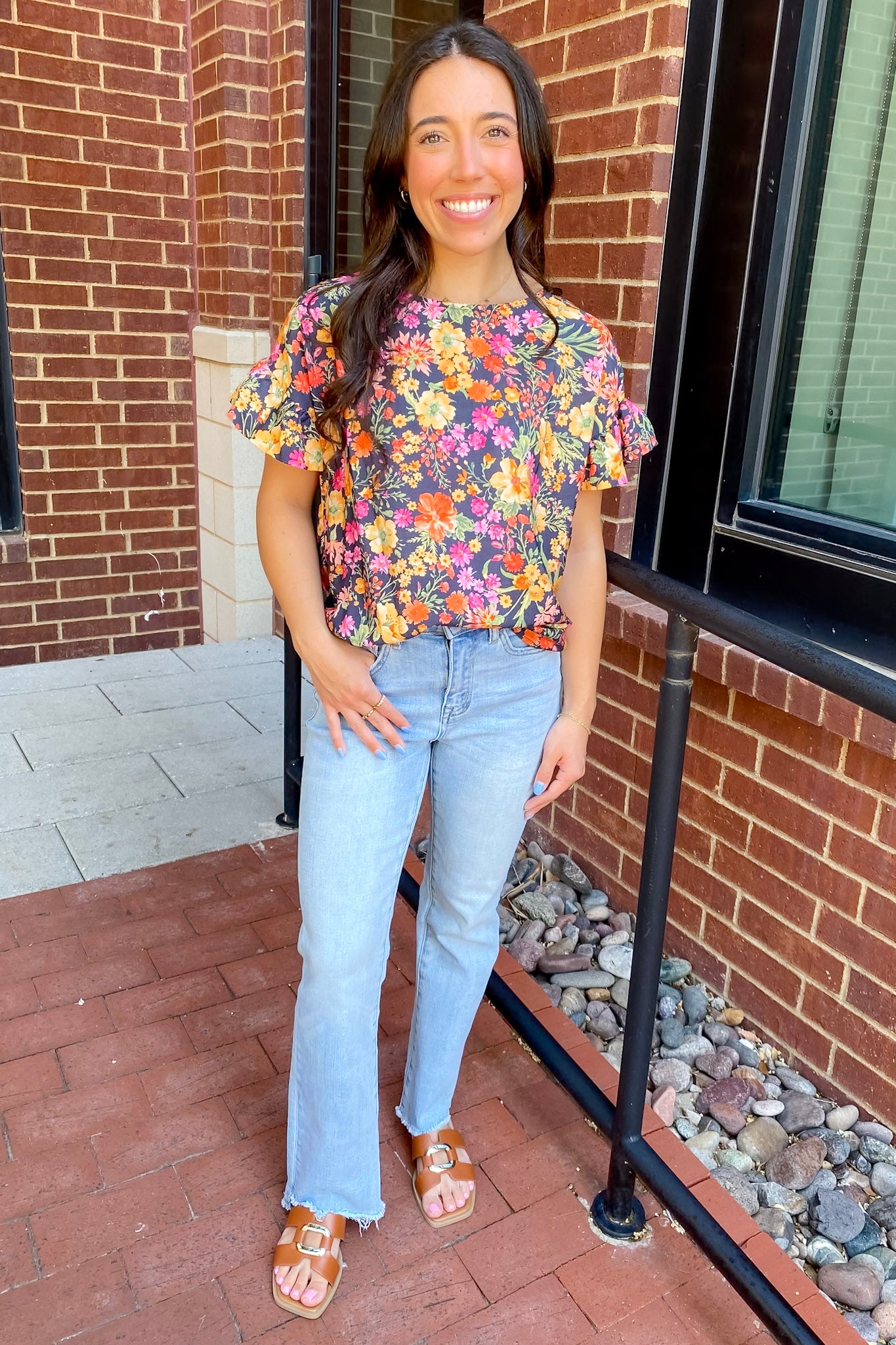This lively floral top brings a burst of color to your outfit. The flutter sleeves and relaxed fit give it a feminine, easygoing vibe, while the bold floral print makes it an instant statement piece. Light and breathable, it’s great for sunny days or layering under a cardigan.