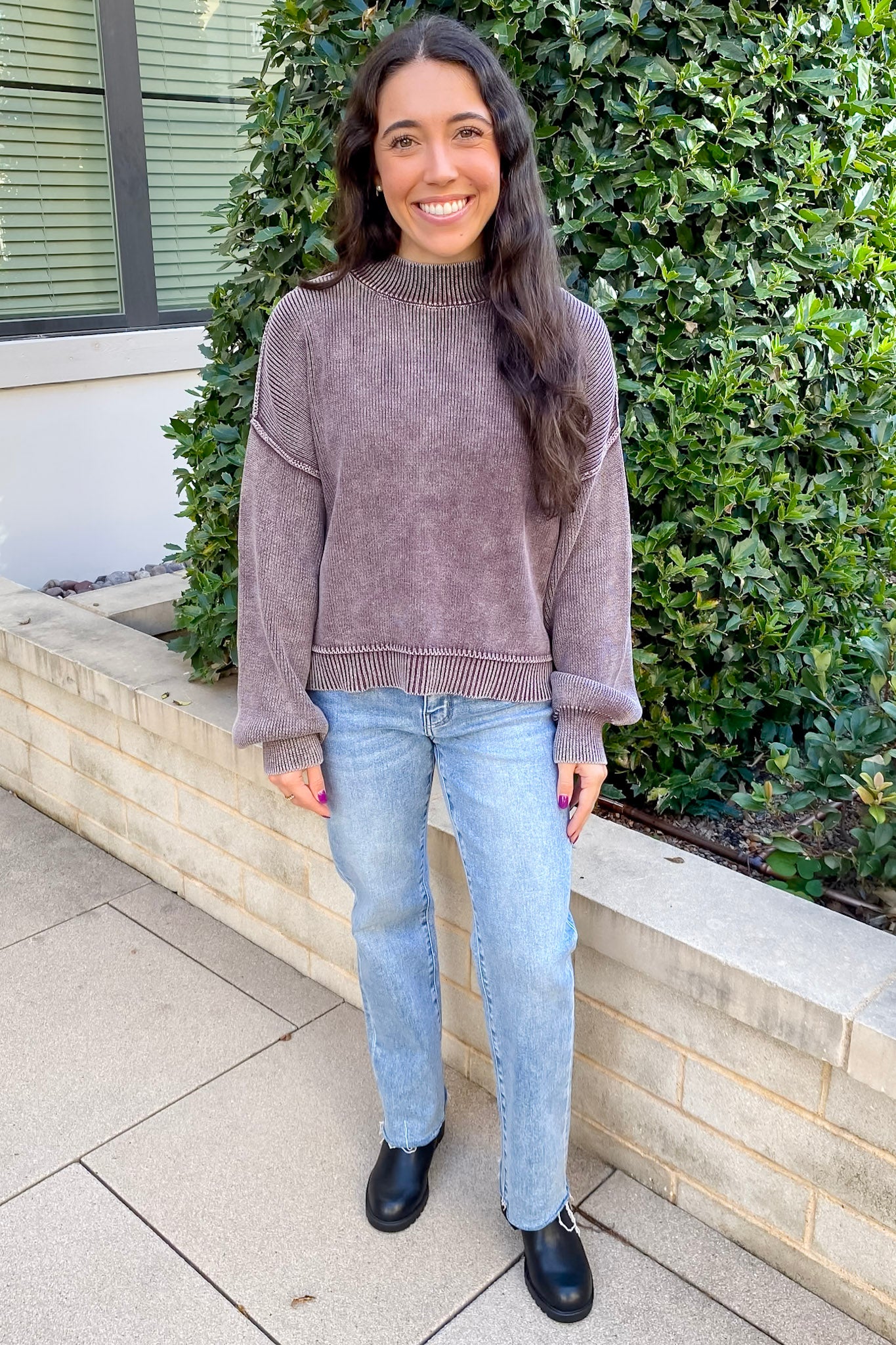 The Never Know Mock Neck Plum Cocoa Sweater is a soft, mineral-washed sweater with cool lived-in vibes. Its ribbed texture, mock neckline, and exposed stitching give it just enough edge while keeping things cozy and wearable. The relaxed silhouette makes it an easy piece to throw on and look effortlessly put together—perfect for those crisp fall days when you want comfy but cute.