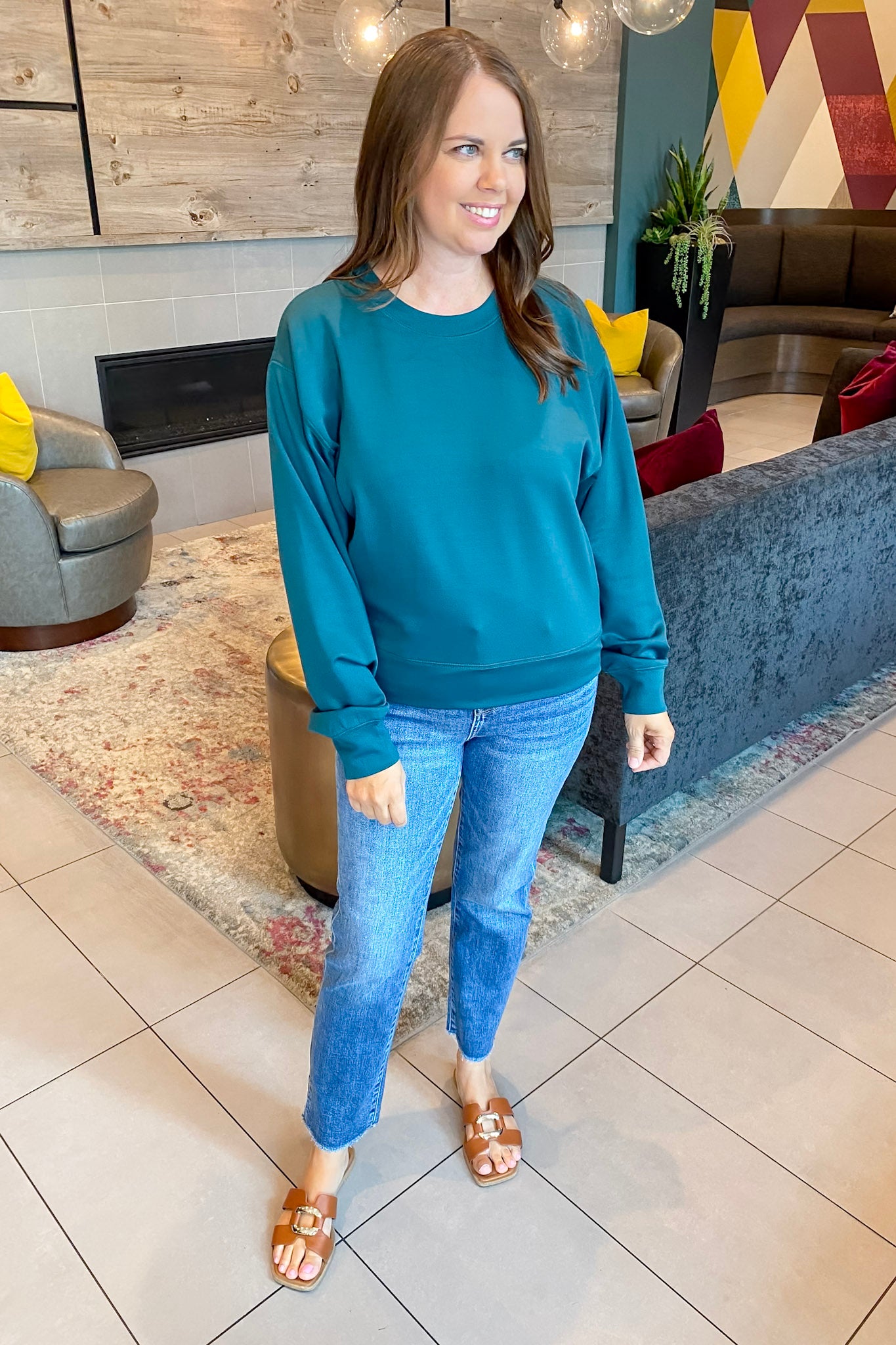 Clean, crisp, and oh-so-cozy — this deep green sweatshirt is the ultimate cool-weather staple. With its slightly cropped length and structured-but-soft feel, it brings just the right amount of polish to your laid-back looks. Think effortlessly cute with a touch of sporty spice.
