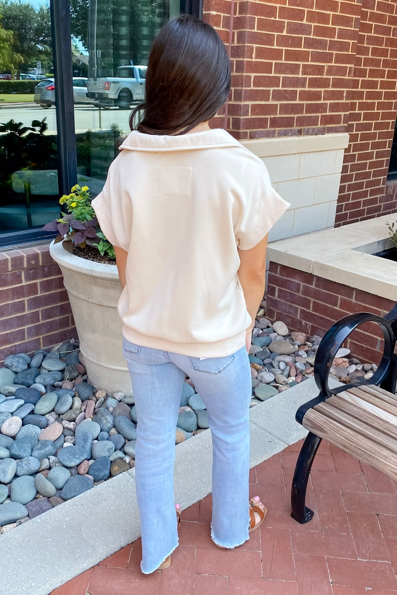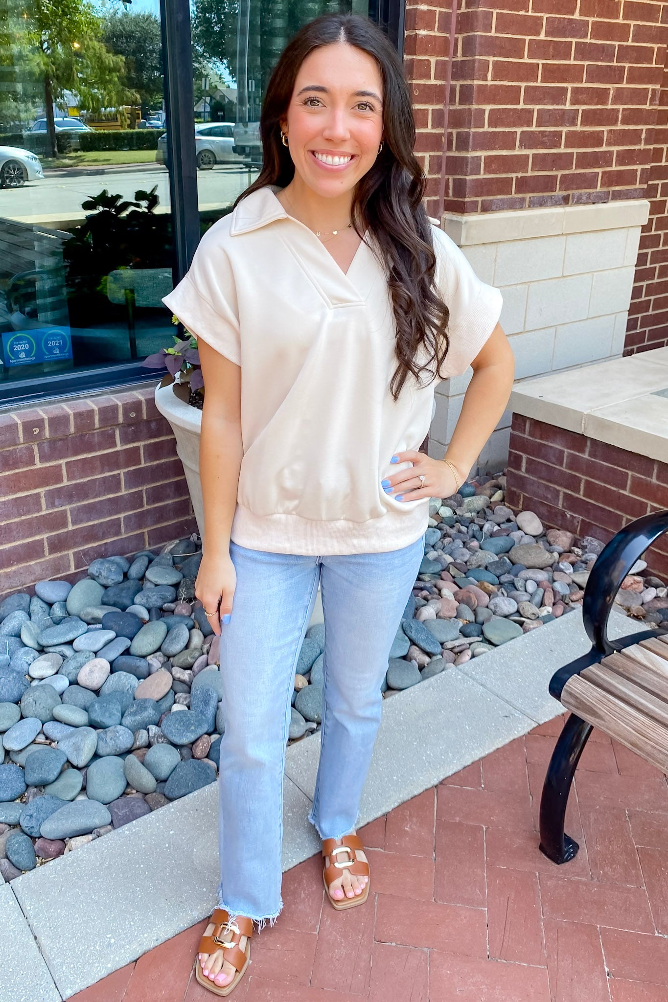 Sporty meets sweet in this ecru taupe-colored polo dress that’s made for easy fall layering. The soft sweatshirt material, banded hem, and relaxed fit give off effortless athleisure vibes—while the bold color keeps things playful. Finished with a collared neckline and wide cap sleeves, it’s the perfect throw-on-and-go piece with major style points.