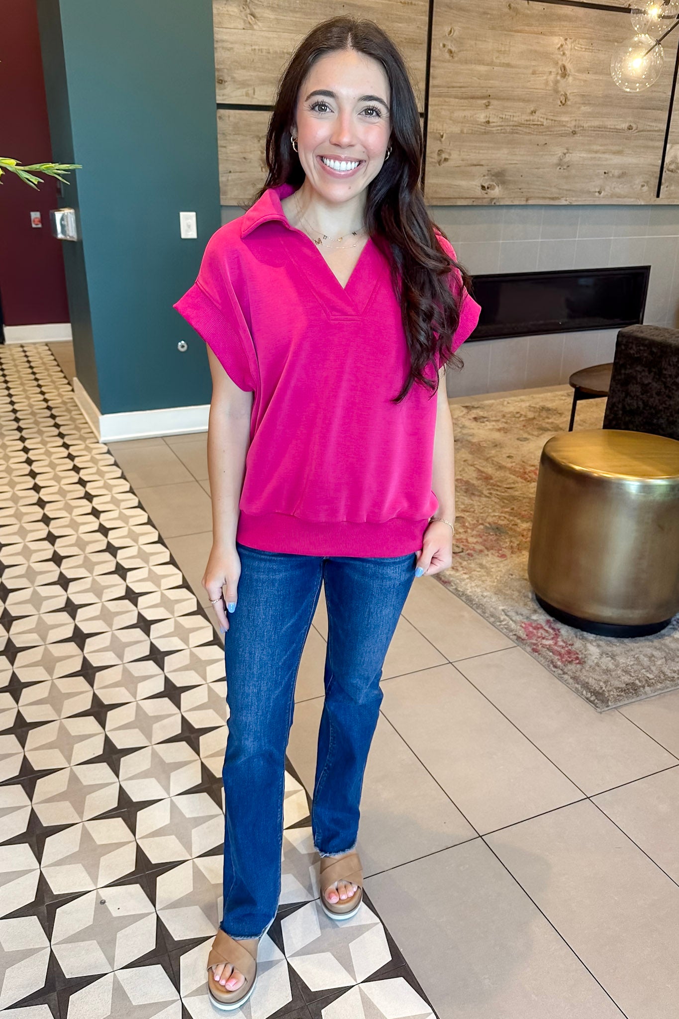 Sporty meets sweet in this raspberry-colored polo dress that’s made for easy fall layering. The soft sweatshirt material, banded hem, and relaxed fit give off effortless athleisure vibes—while the bold color keeps things playful. Finished with a collared neckline and wide cap sleeves, it’s the perfect throw-on-and-go piece with major style points.
