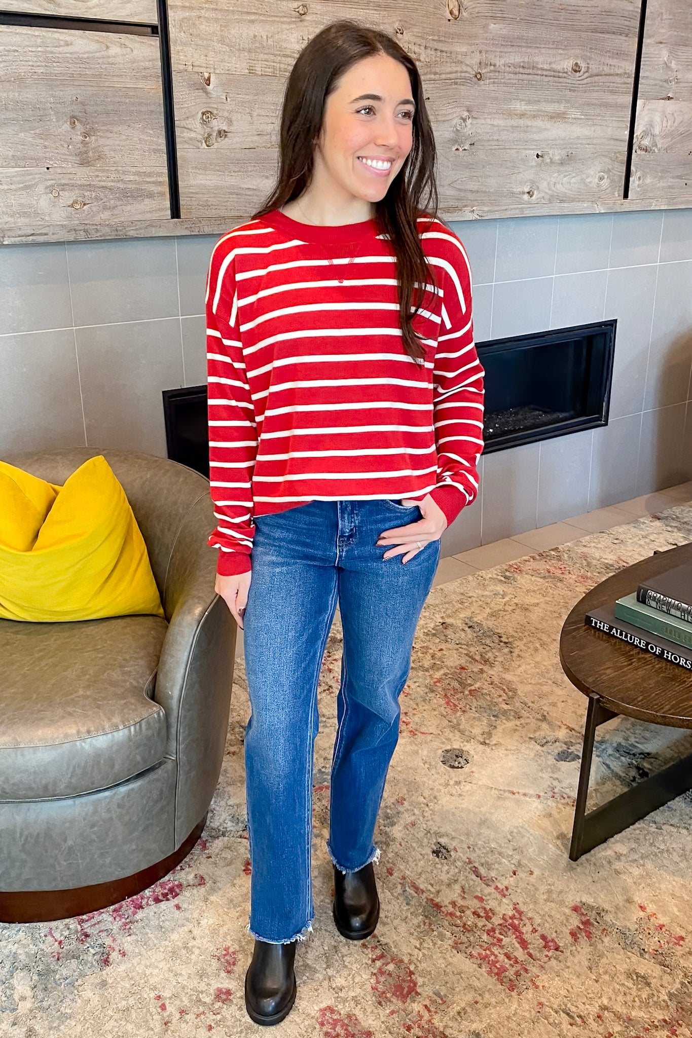 Bold, bright, and effortlessly cozy — the Pump It Up Striped Red Sweater is a cool-weather must-have. With deep red tones and classic white stripes, this lightweight knit brings the perfect pop of playful color to your fall layers. The relaxed fit and soft feel make it a dream to wear, while the crisp stripe pattern keeps things cute and polished. Whether you’re lounging or out and about, this sweater keeps it comfy and fun.