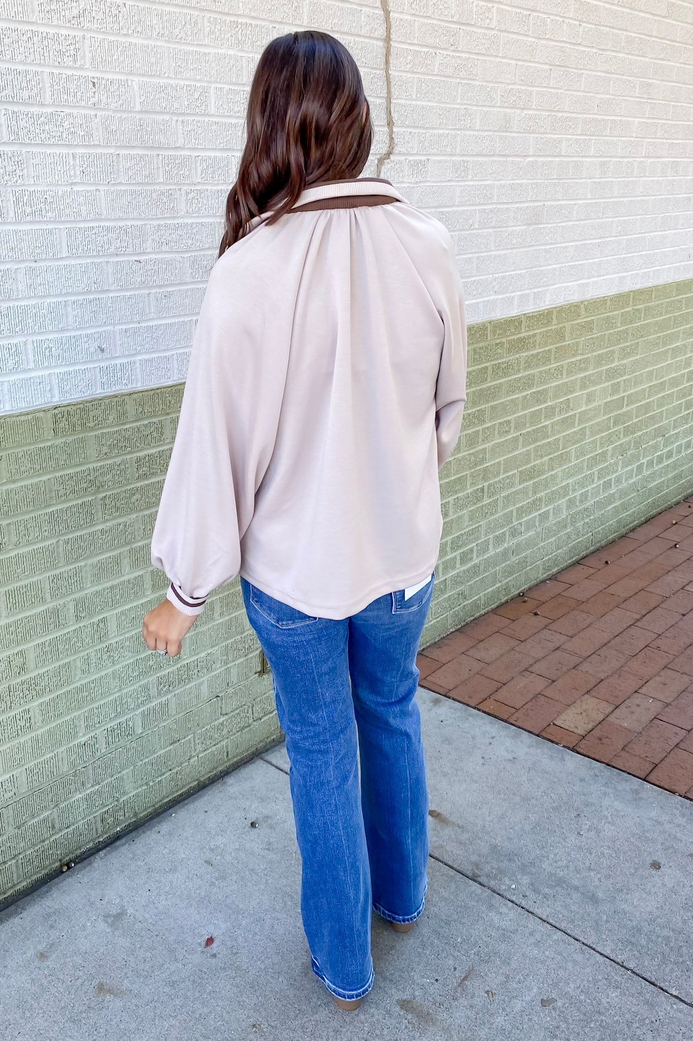 Cool, casual, and effortlessly polished—The Blush Latte Zip Pullover is your new neutral fave for fall. With its soft blush tone, relaxed fit, and sporty striped collar peeking out when unzipped, this top brings elevated coziness to your everyday style. The elastic cuff detail adds just the right amount of bounce, while the half-zip neckline lets you control the vibe—zipped up for sleek or unzipped for laid-back layers.