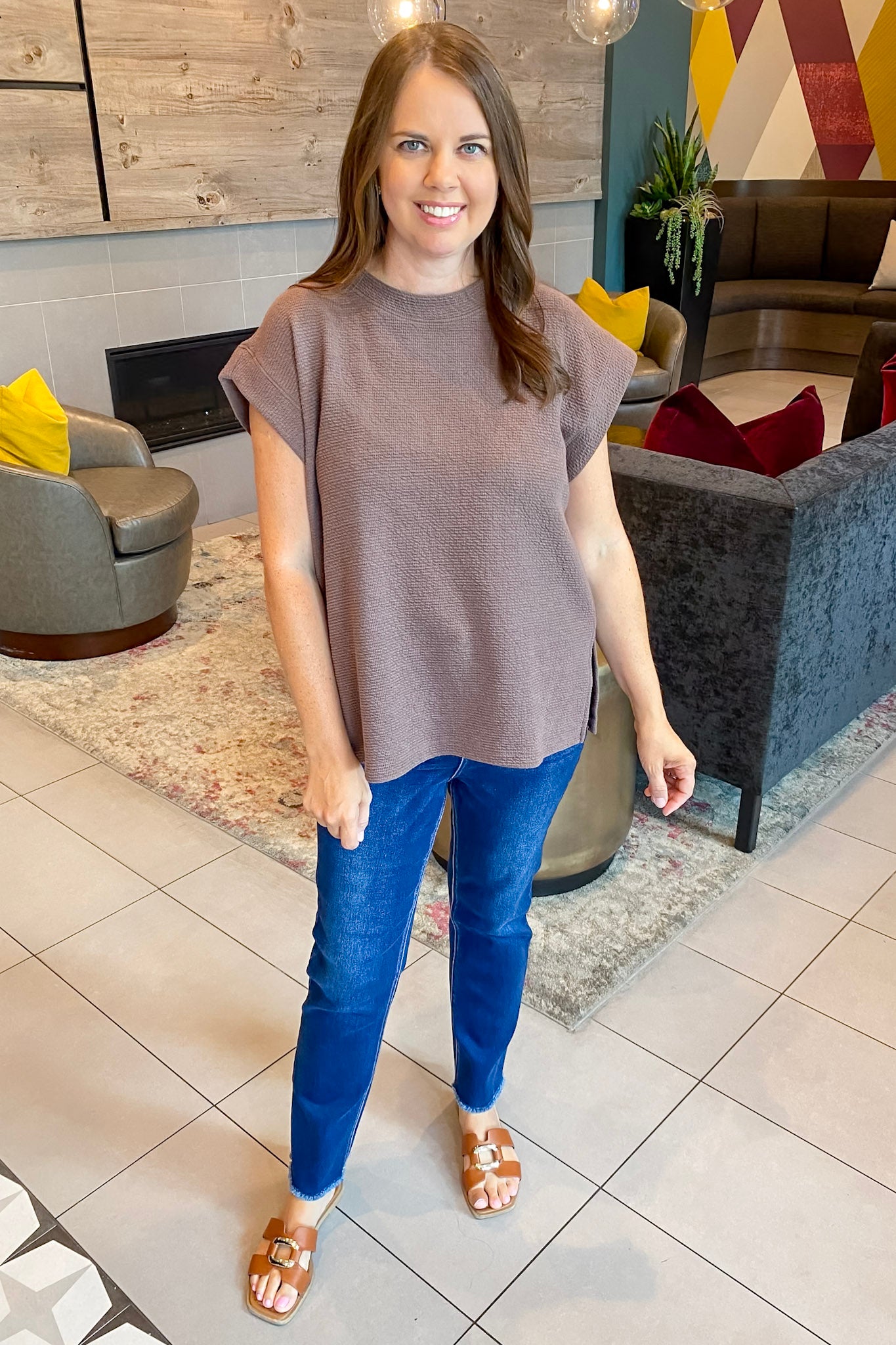 Soft, simple, and stylish—this cap sleeve knit top is the kind of staple your fall wardrobe dreams of. The structured shoulders give it just enough shape, while the textured fabric keeps things cozy and cute. It’s neutral, easy to layer, and plays well with everything from denim to shackets. Think of it as your “wear-it-on-repeat” top that still feels totally put-together.