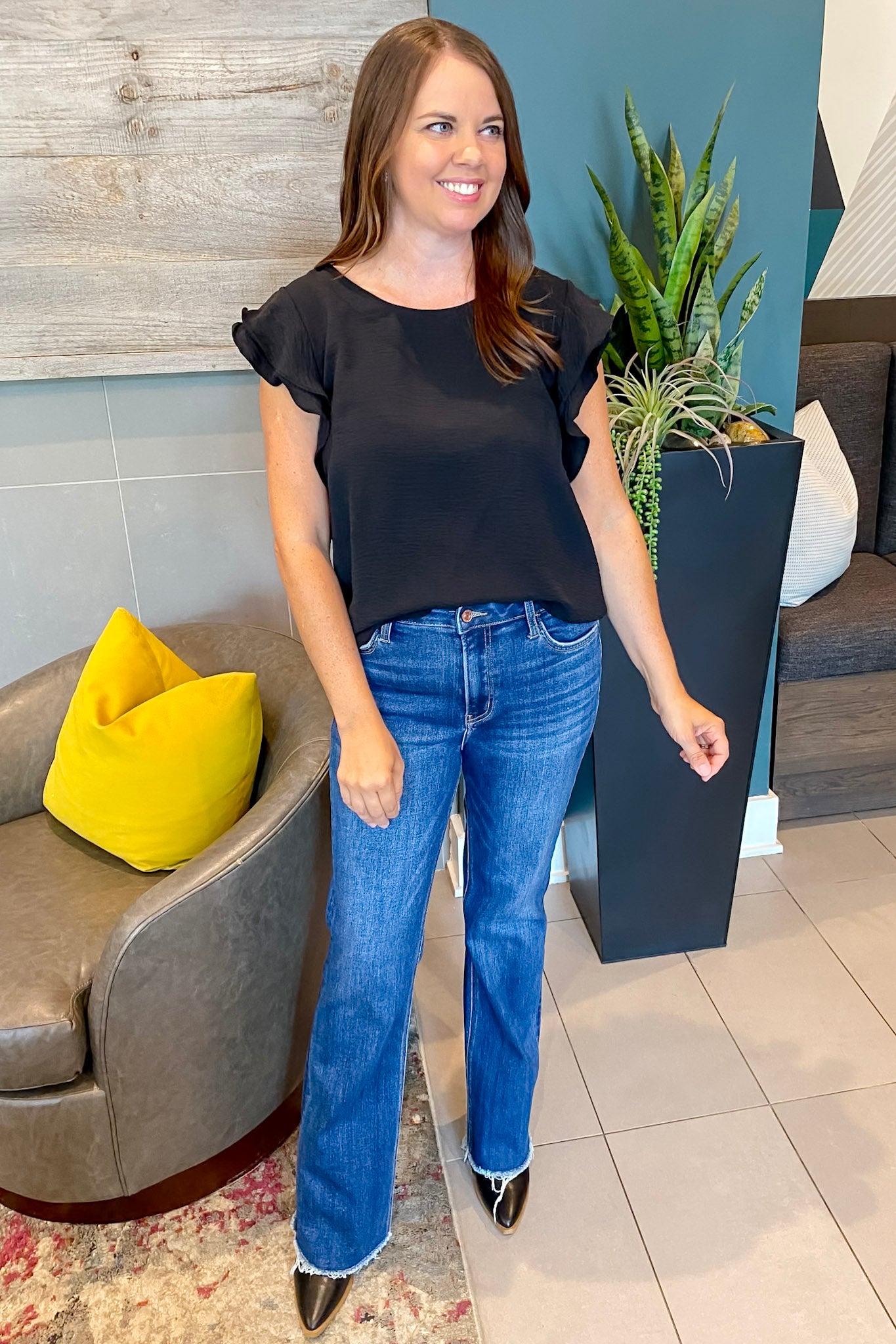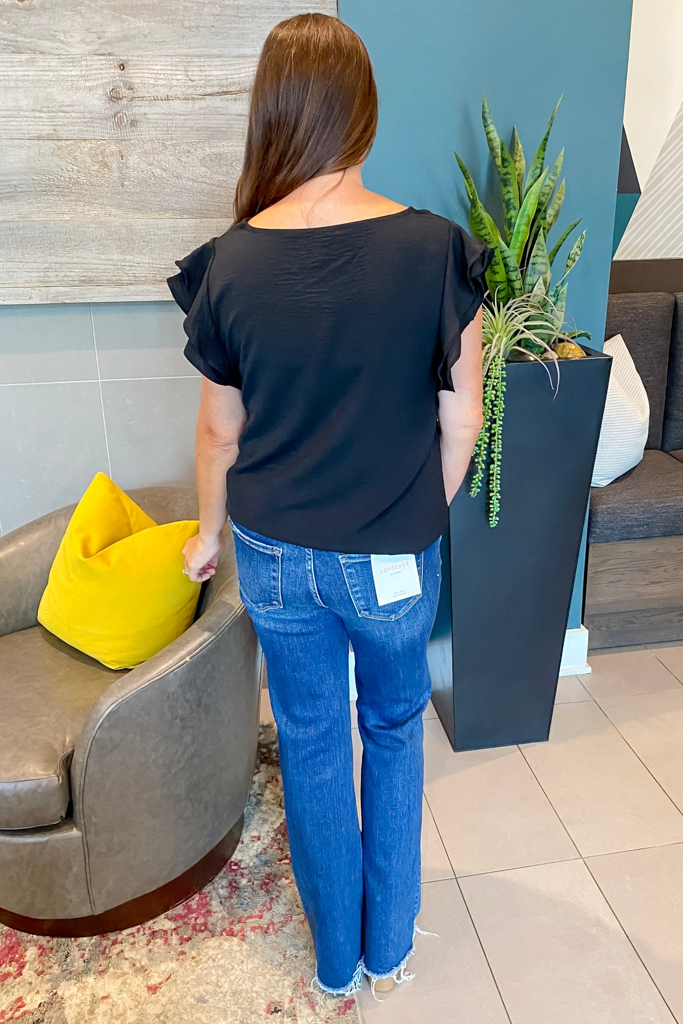 Brighten up your fall wardrobe with this bold, black-toned flutter sleeve top. The soft drape and playful ruffle details make it a standout piece that’s as easy to style as it is to wear. Perfect for transitioning from day to night, this top brings a pop of fun to any autumn outfit.